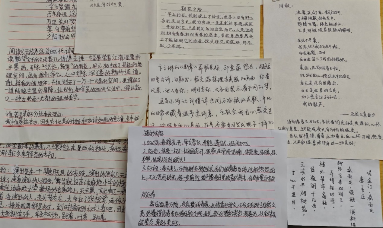 活动现场书香弥漫、诗意盎然。诗朗诵环节,同学们诵读《鸟鸣涧》《春雨足》《雨巷》等经典春日诗篇,在优美文辞中感受诗意与生机;阅读分享环节,大家围绕《朝花夕拾》《断章》《草房子》等作品交流心得,分享文字里的成长力量与青春哲思;摘抄与感悟展示中,同学们用笔触定格春日佳句,抒发成长感悟。现场互动热烈,大家以诗为媒、以读会友,在交流中传递书香热爱。