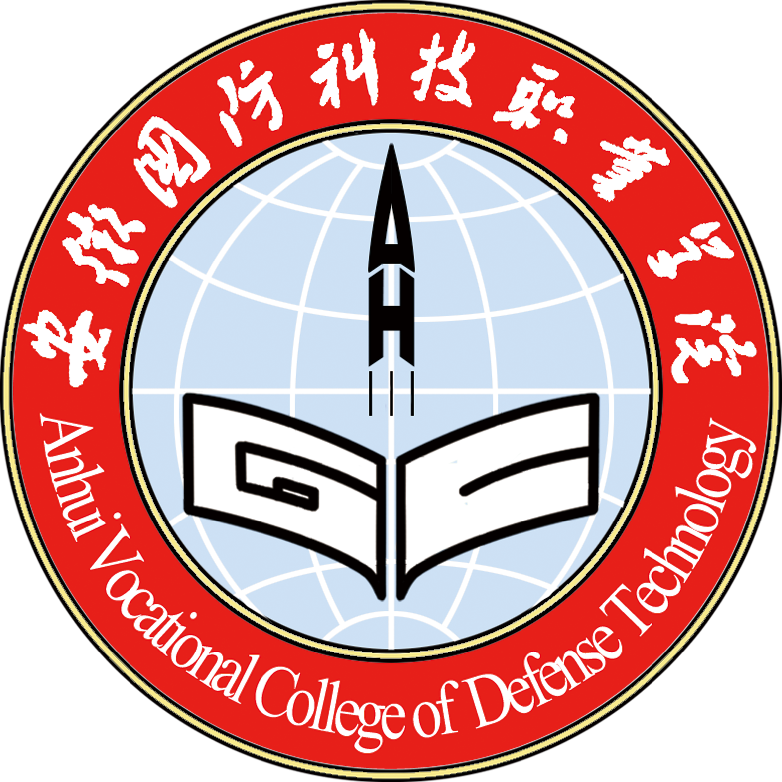 ”,校徽图案是通过对“安徽国防”四个字的拼音字母“AHGF”进行变形组合产生。“A”“H”组合成一个正在腾飞的火箭,代表学校发展前进动力,体现军工特色;“G”“F”组合外观为一本展开的书,具有教书育人之含义。