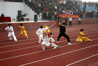 随后进行了集体操表演,四系和武术社团分别表演了团体操、健美操、旗舞、博击操和武术。