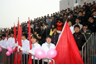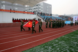 瞧,朝气蓬勃的国旗护卫队手迈着矫健的步伐,护拥着鲜艳的五星红旗、校旗和院第五届运动会会旗走进体育场。紧随其后的是来自全院24个专业的代表队。