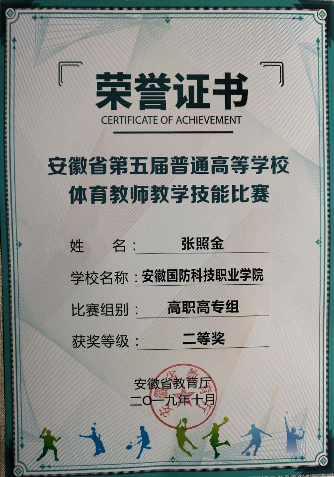 近日,安徽省教育厅下发了安徽省第五届高校体育教师教学技能比赛获奖证书,万象城官网基础部张照金老师荣获安徽省第五届高校体育教师教学技能比赛荣获二等奖。