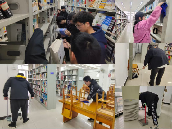 在活动中,学生们手持清洁工具,对图书馆各个区域进行了细致入微的清扫与整理,包括书架擦拭、书籍归类、地面清洁等等,他们用辛勤的汗水换来了图书馆的一片整洁明亮。