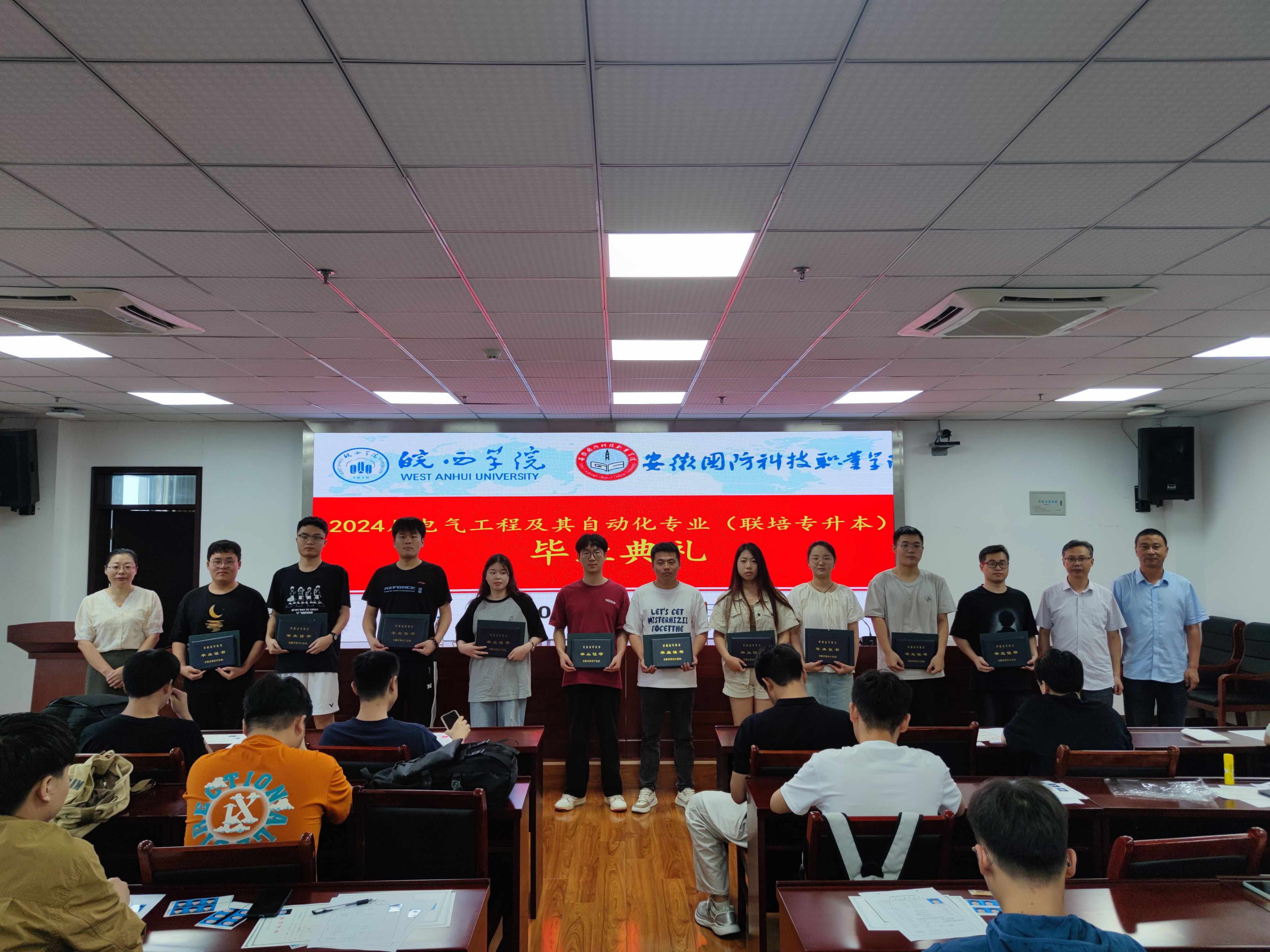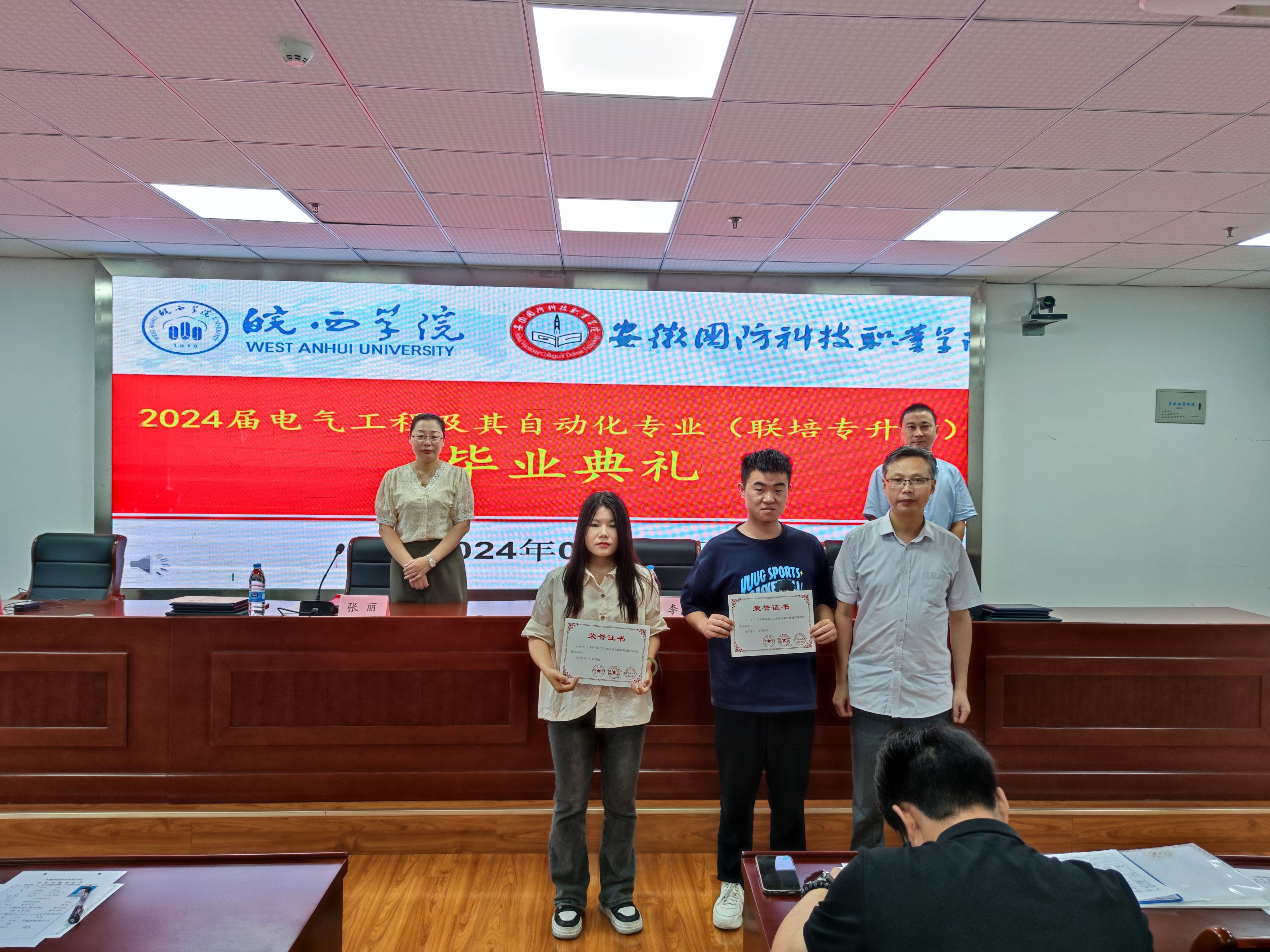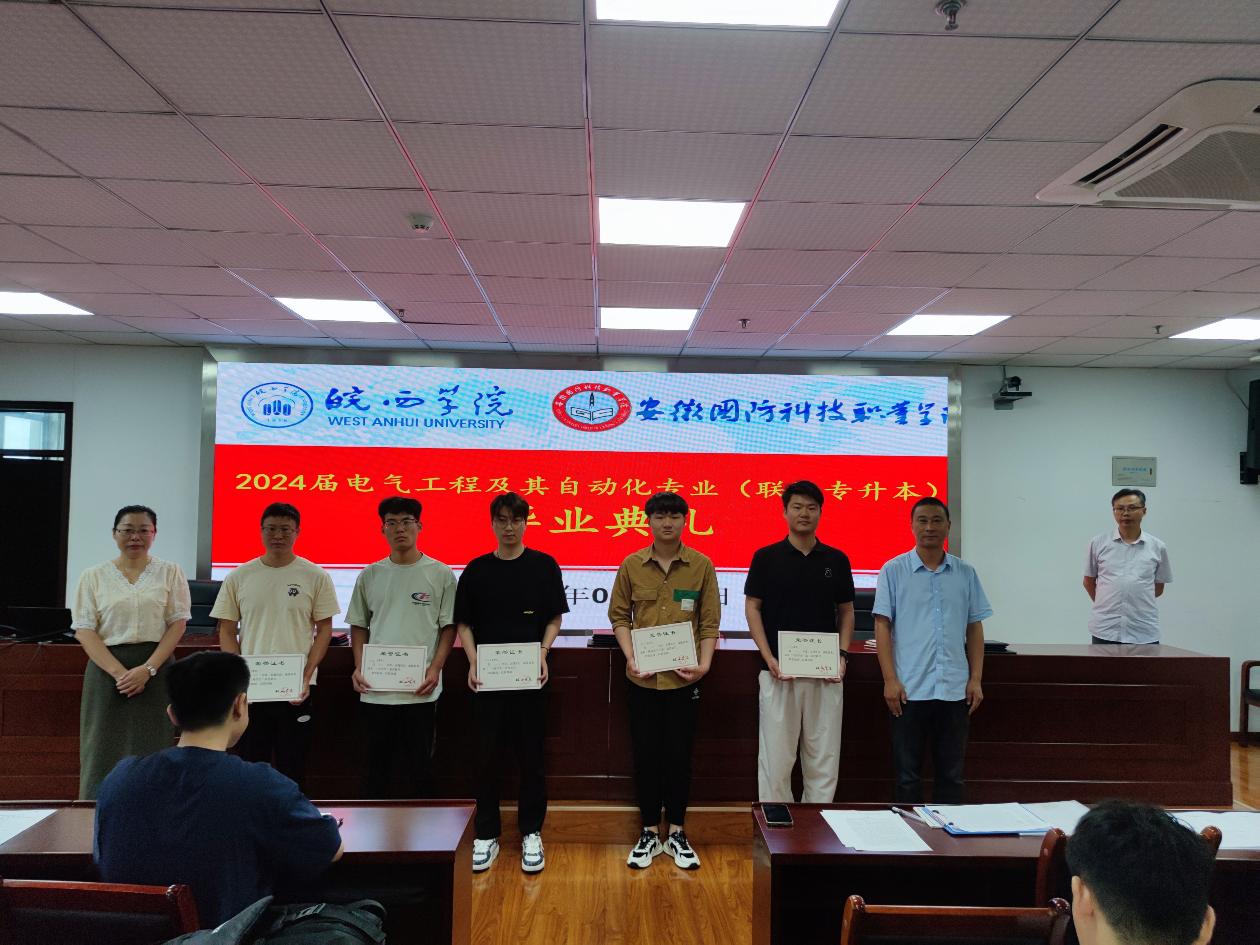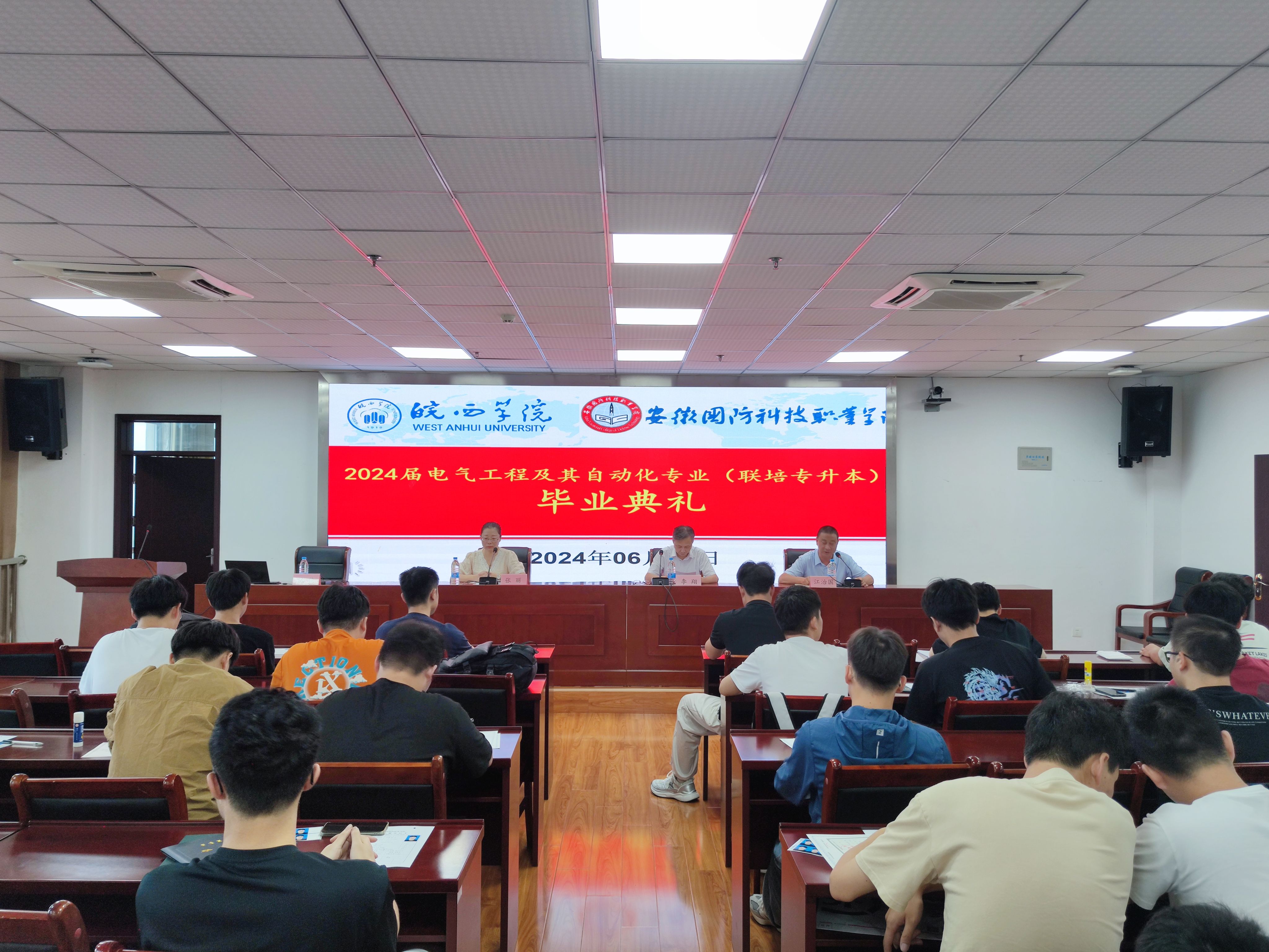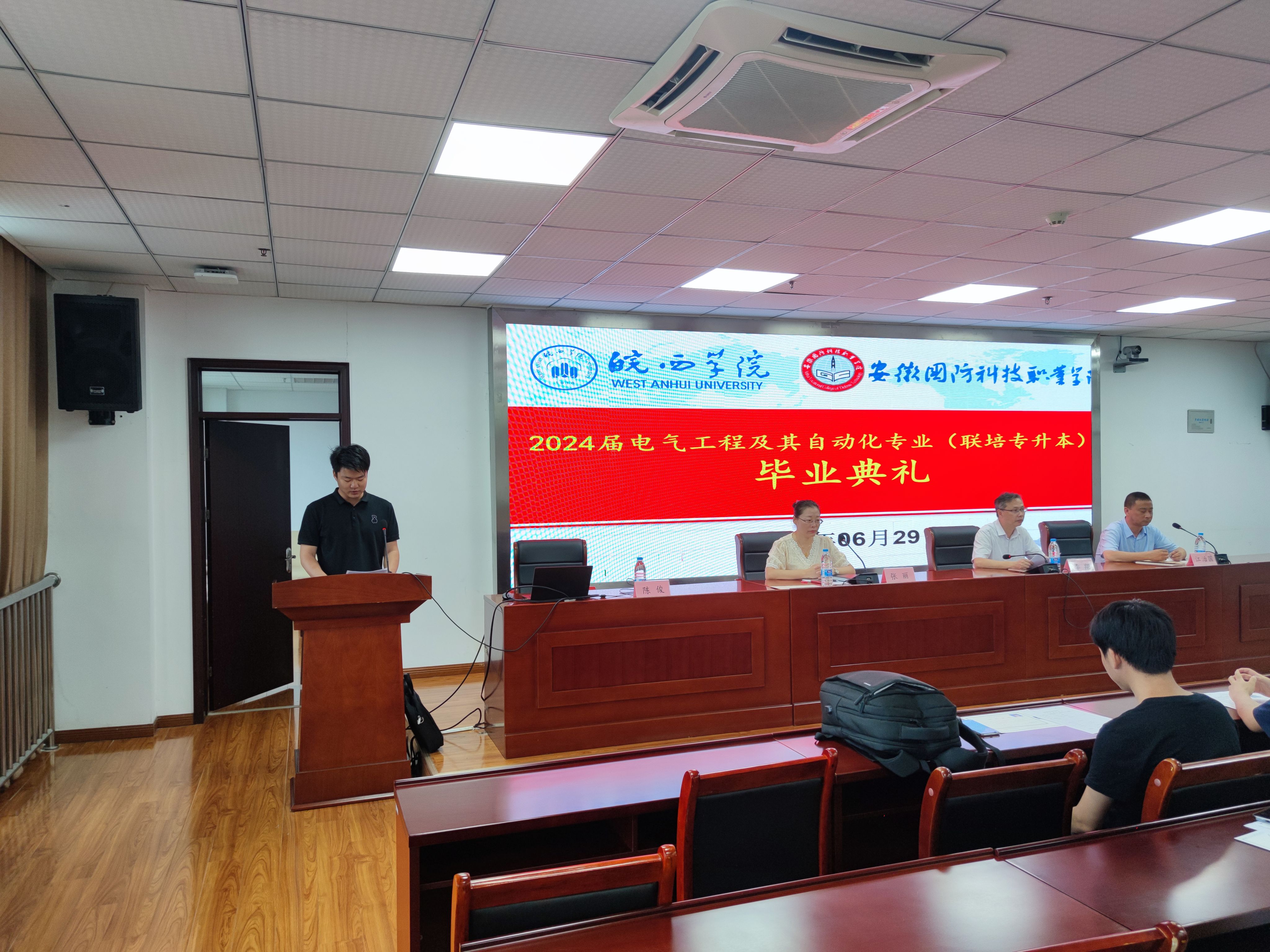 本网讯 2024年6月29日上午,皖西学院与万象城体育awcsport专升本联合培养电气自动化技术专业 2024 届毕业生毕业典礼在秉心楼12楼会议室隆重举行。电气技术学院领导、教师以及全体 2024 届电气自动化技术专升本毕业生共同见证了这一重要时刻,会议由电气技术学院副院长江治国主持。