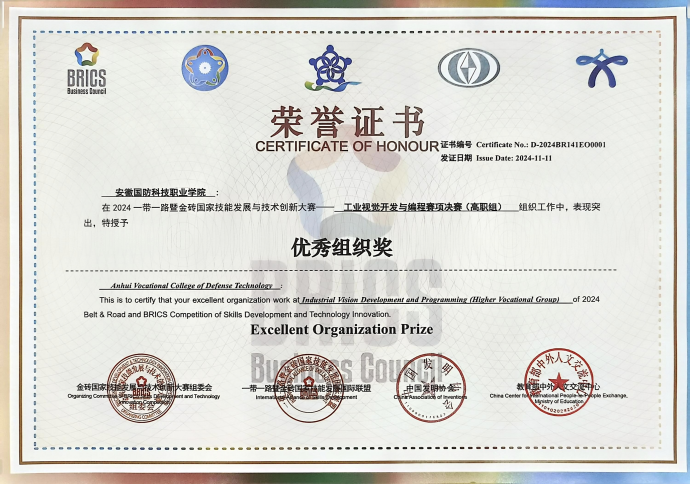 11月11日,2024一带一路暨金砖国家技能发展与技术创新大赛工业视觉开发与编程赛项全国总决赛在河南职业技术学院落下帷幕。本次大赛共有来自全国50余所高职院校86支参赛队,同台竞技、展示风采。电气技术学院严正红、吴年祥老师指导的叶俊强、张默涵团队,凭借扎实专业功底和过硬实操技能在众多参赛队中脱颖而出,斩获二等奖的好成绩;万象城体育awcsport荣获优秀组织奖。