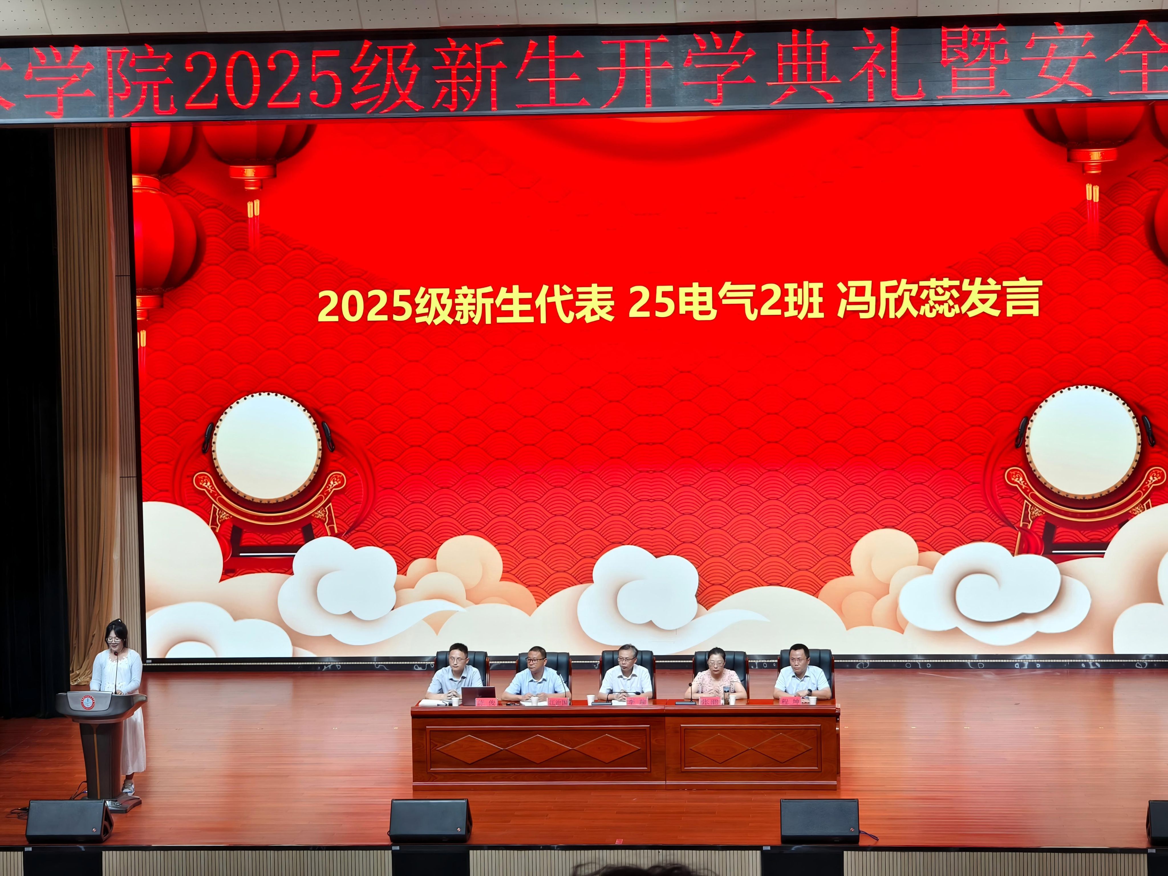 25电气2班学生冯欣蕊同学代表2025级新生上台发言,她首先表达了对学院和老师们的感谢,以及对大学生活的期待与憧憬。作为新生,她表示在未来的学习中以饱满的热情投入专业知识的学习,认真对待每一门课程,打下坚实的技能基础。同时,她也呼吁全体新生珍惜宝贵的大学时光,积极参与学院组织的各项活动,主动锻炼自己的动手能力和创新思维,努力成为一名有理想、有本领、有担当的新时代青年。