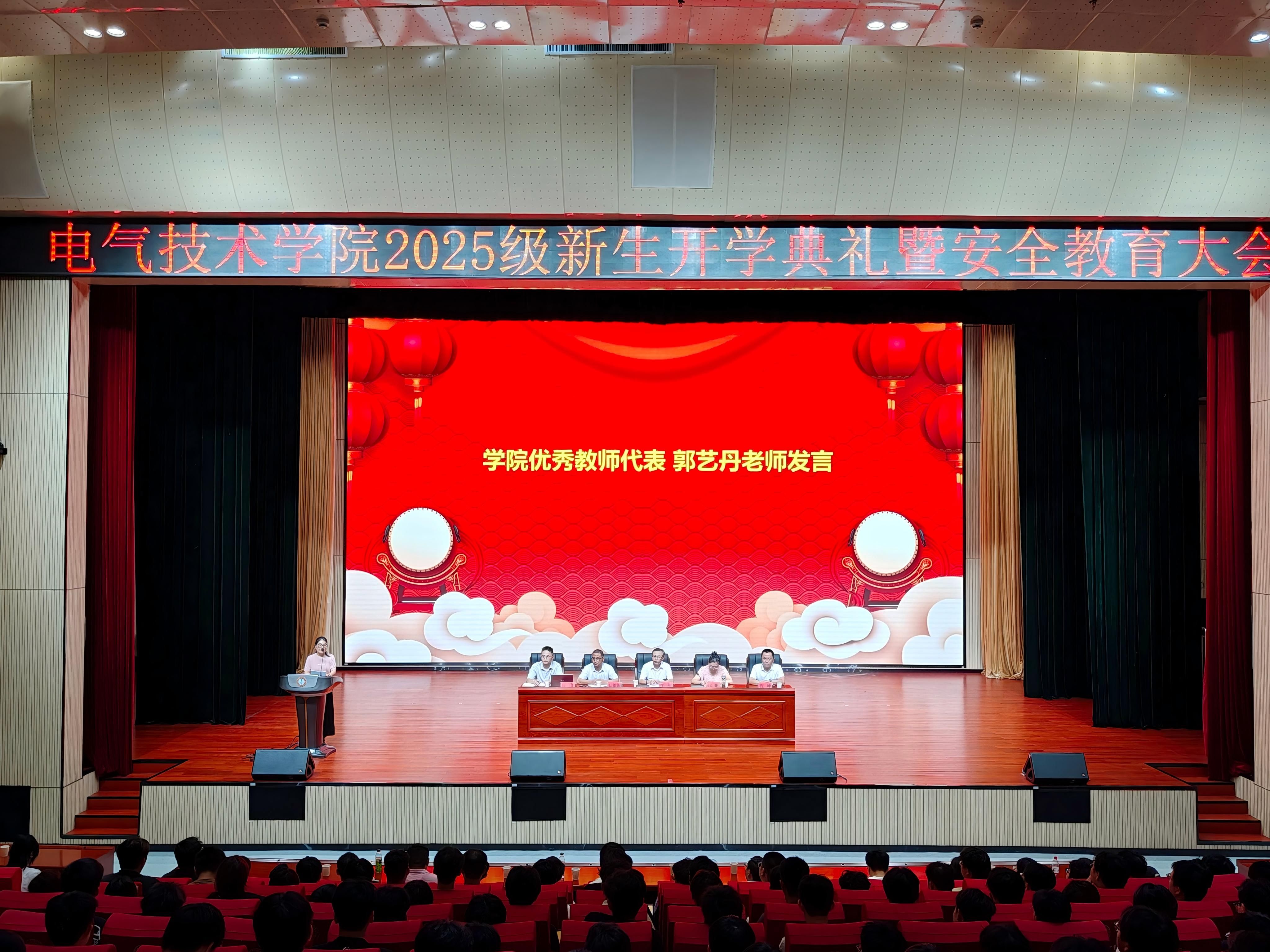 本网讯(电气技术学院 江治国)9月11日,电气技术学院在产教融合中心报告厅隆重举行了2025级新生开学典礼暨安全教育大会。学院党政领导、各专业带头人、骨干教师以及2025 级新生齐聚一堂,开学典礼在庄严的国歌声中拉开序幕。