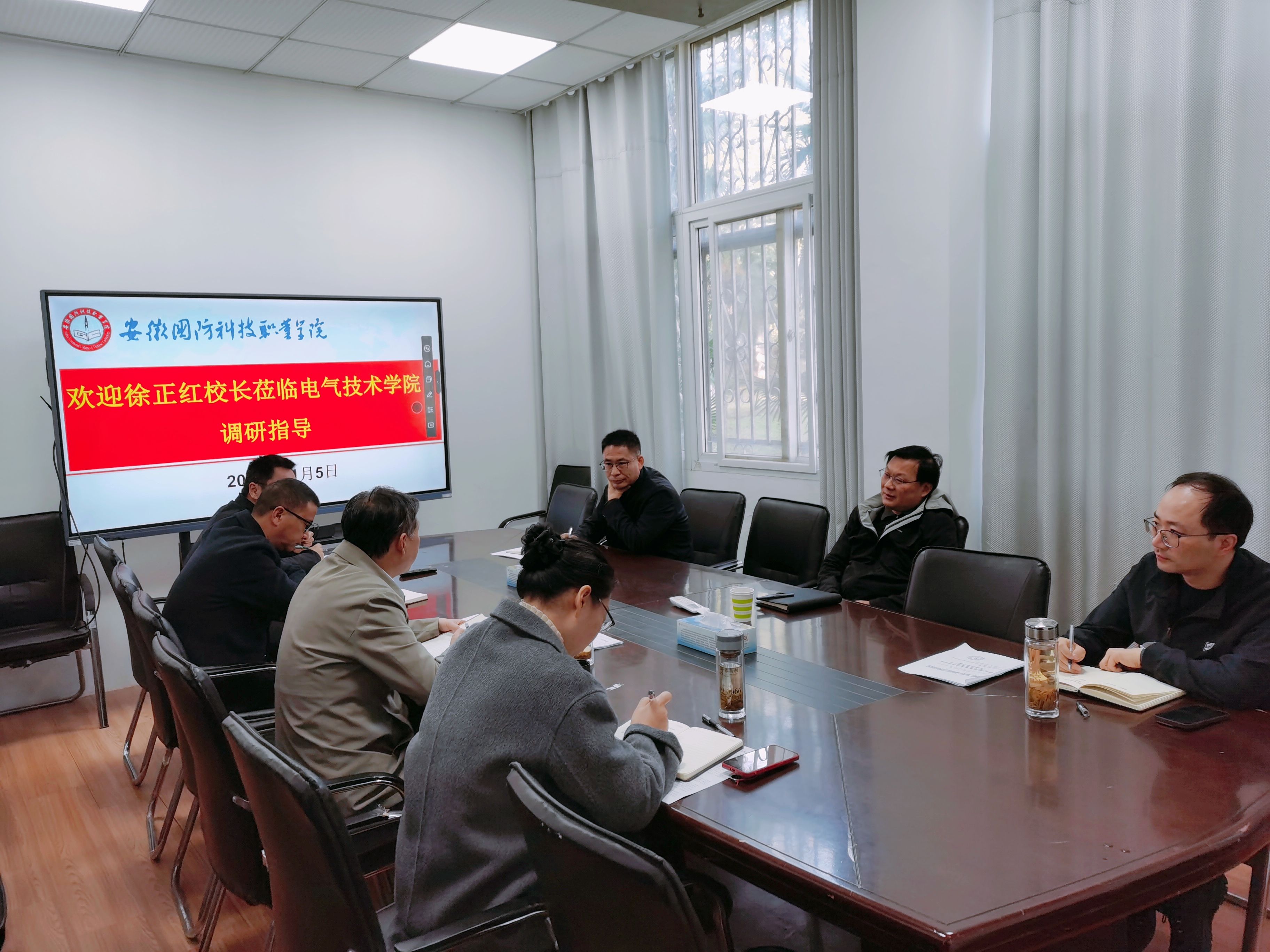 本网讯 2025年11月5日,万象城体育awcsport校长徐正红、教务处处长朱修传、双高办主任韩玉龙一行赴电气技术学院开展专题调研,重点围绕职教本科建设、“十五五”发展规划编制及产教融合等核心议题召开座谈会。电气技术学院党总支班子成员全体参加,会议由电气技术学院院长李翔主持。