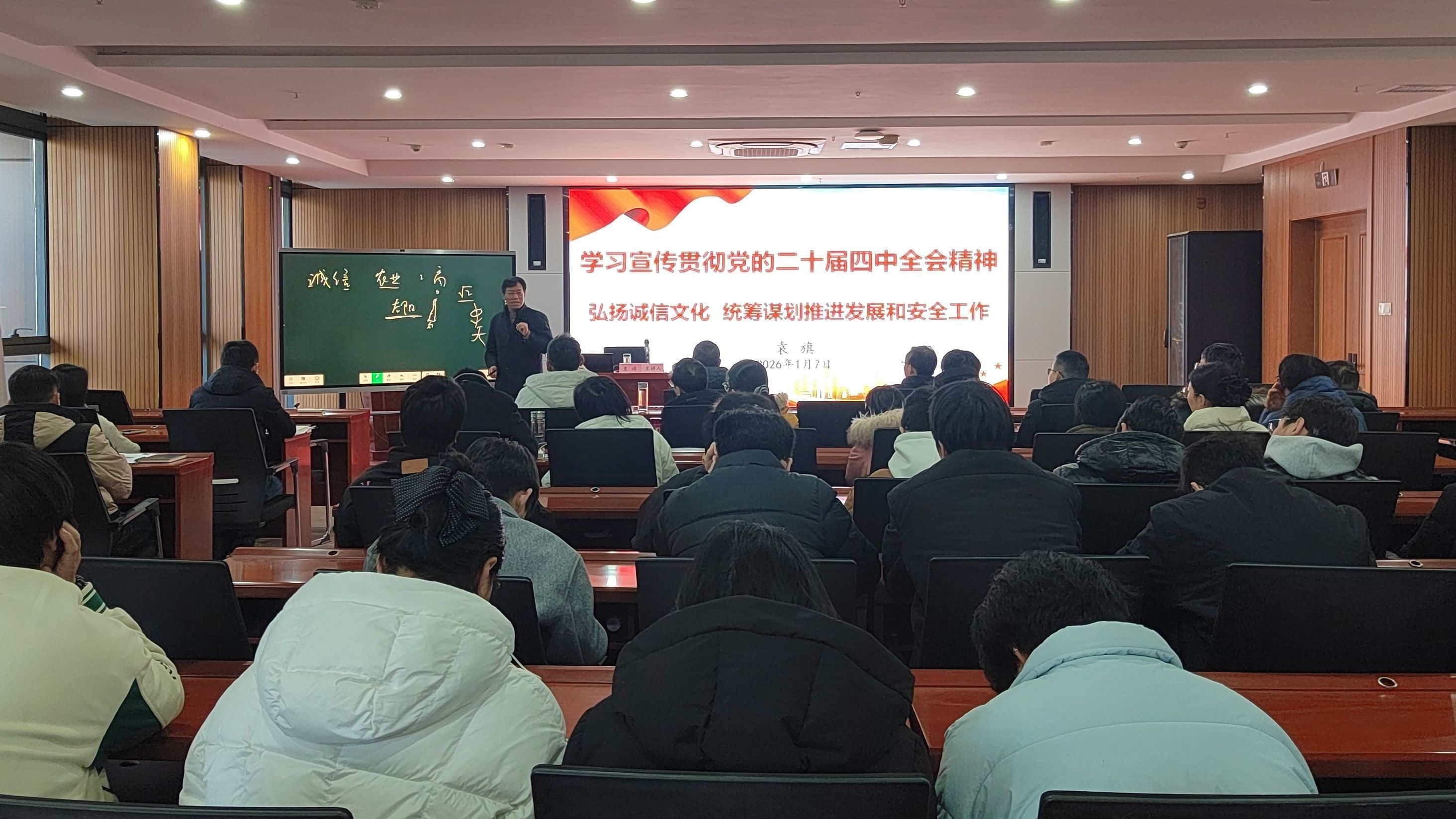 本网讯  1月7日下午,校党委委员、副校长袁旗在产教融合中心第一报告厅为电气技术学院全体党员、入党积极分子和学生干部代表宣贯党的二十届四中全会精神。电气学院全体教职工党员、学生党员和入党积极分子及学生干部代表近百人现场聆听了党课。