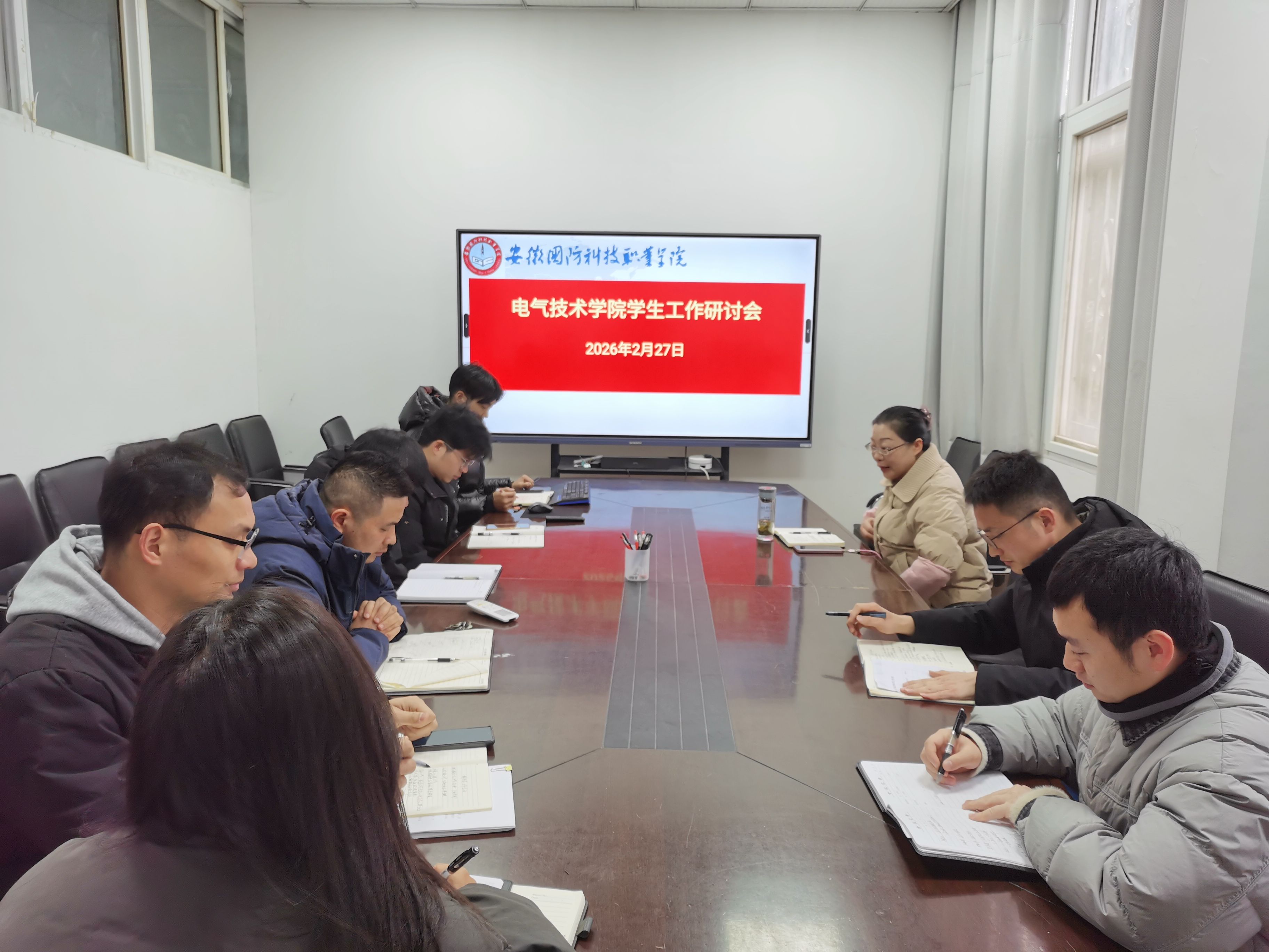 本网讯(电气技术学院 孙焕)为科学谋划2026年春季学期学生管理工作,明确工作方向、细化工作举措,扎实做好新学期学生工作,2月27日上午,电气技术学院在知行楼102室召开期初学生工作研讨会。学院党总支副书记张丽(主持工作)主持会议,全体专职辅导员参会。