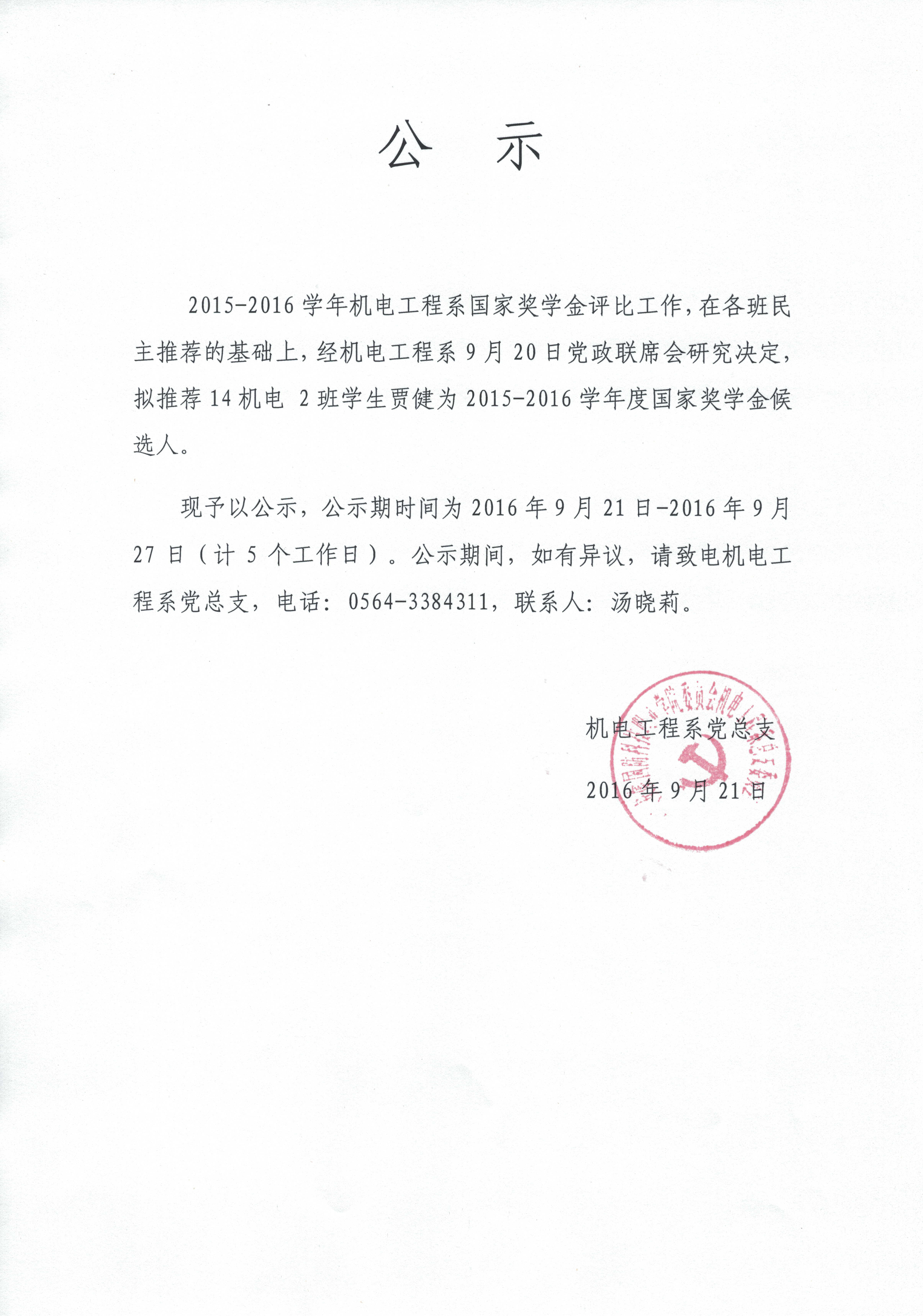 上一条:关于机电工程系2015-2016学年度学院奖学金评比结果公示 下一条:关于机电工程系2015-2016学年度国家励志奖学金评比结果公示