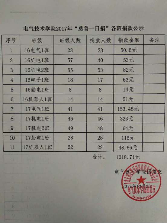 根据《关于在全校开展2017年“慈善一日捐”活动的通知》(校办〔2017〕36号)文件精神,电气技术学院2017年“慈善一日捐”活动圆满结束,捐款具体情况如下: