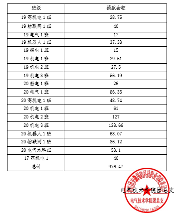 根据校办〔2020〕39号文件关于在全校开展2020年“慈善一日捐”活动的通知,电气技术学院团总支积极组织在校各班级进行全民慈善、扶贫济困的自愿捐款活动,现将电气学院在校各班级收集捐款情况公示如下:
