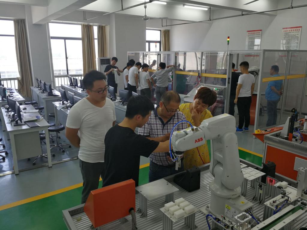 2018年6月25日北京华航唯实机器人科技有限公司陆工程师在我院电工电子与自动化实训中心工业机器人综合实验室(综合楼706)对我院师生进行为期一周的工业机器人培训。培训期间,我院师生积极参与此次培训,认真听讲,操作热情高,并与企业工程师对工业机器人方面的疑惑进行充分的交流。我院师生在此次培训中获益良多,知识和能力都有不同程度的提高。
