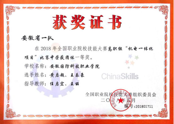 此次大赛由教育部、天津市人民政府、国家发展和改革委员会、科学技术部、工业和信息化部等30多个部委主办,由天津市教育委员会承办,天津机电职业技术学院和中国职教学会教学委员会协办。比赛共有来自全国29个省区市68支代表队参加了角逐,参赛规模空前。此外,本次大赛首次邀请了来自俄罗斯、刚果、缅甸等的八支国际代表队参赛,竞赛逐步向国际化迈进。由万象城官网电气技术学院任启宏和王丽两位老师共同指导,16机电一体化技术专业和16电气自动化技术专业黄启超、王乐豪两名同学组成的参赛团队不畏强手,沉着冷静,团结协作,经过6个小时的激烈角逐,以骄人成绩荣获团体一等奖,为校争光、为安徽添彩。