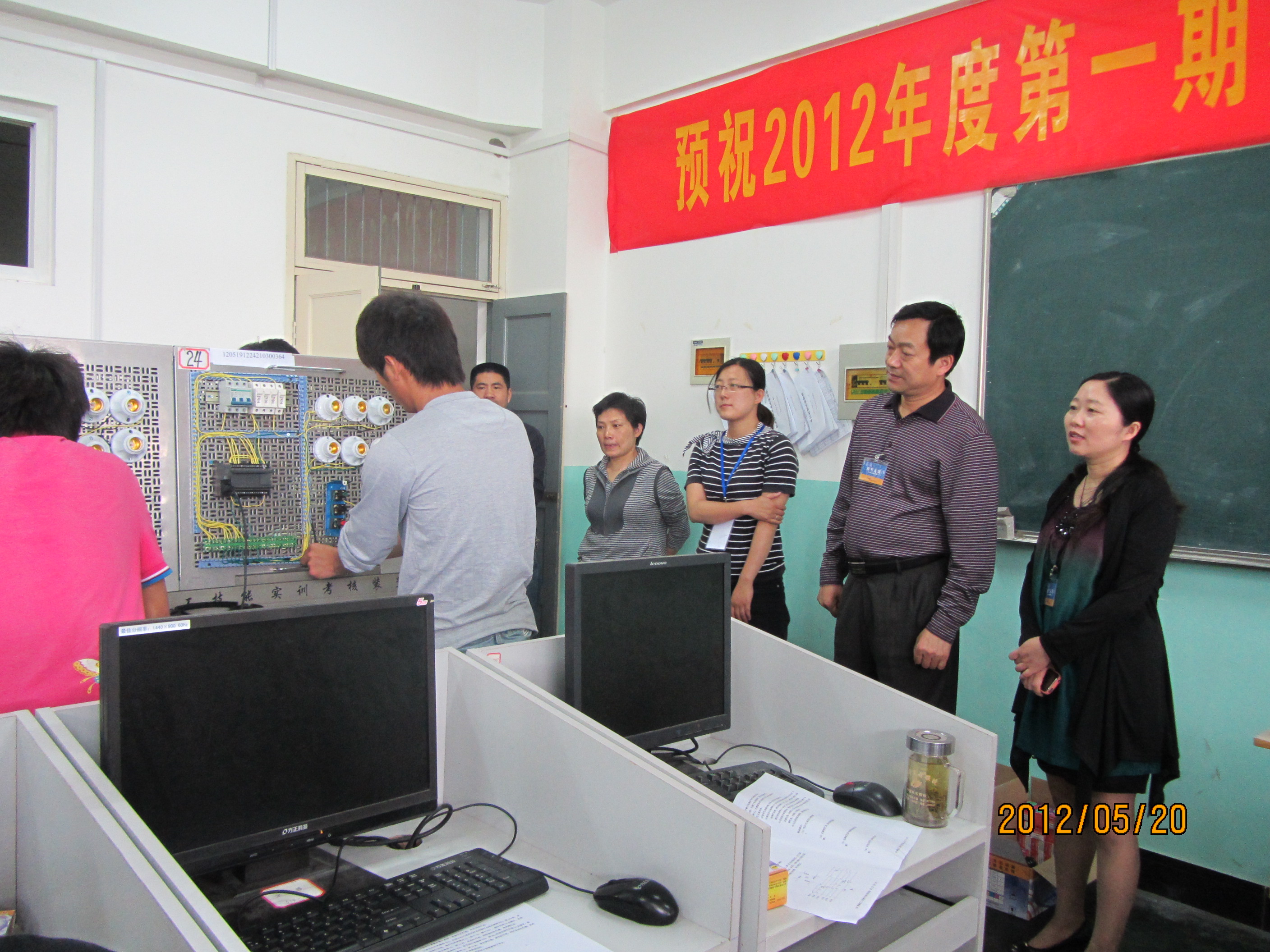 在经过前期各模块的紧张培训后,我系电工电子与自动化实训中心2012年度第一期社会培训项目(维修电工考证培训)于5月19/20日进行了维修电工(高级)的职业技能鉴定(考证)工作,此次考证列入安徽省统考范围,内容分为应知、应会两大模块,其中应会模块又分为十字路口调光灯PLC编程设计安装控制电路、变频器软启动控制电路故障排除、调光灯电子电路装调三个环节。本次鉴定工作在六安市职业技能鉴定中心的全程指导、组织和监控下开展;系实训中心在学院职业技能鉴定站的指导下考前精心准备,确保考证工作顺利实施;考评员认真负责、严格规范、任劳任怨,参考学员沉着冷静、认真操作、稳定发挥,鉴定工作获得了巡考领导的高度评价。