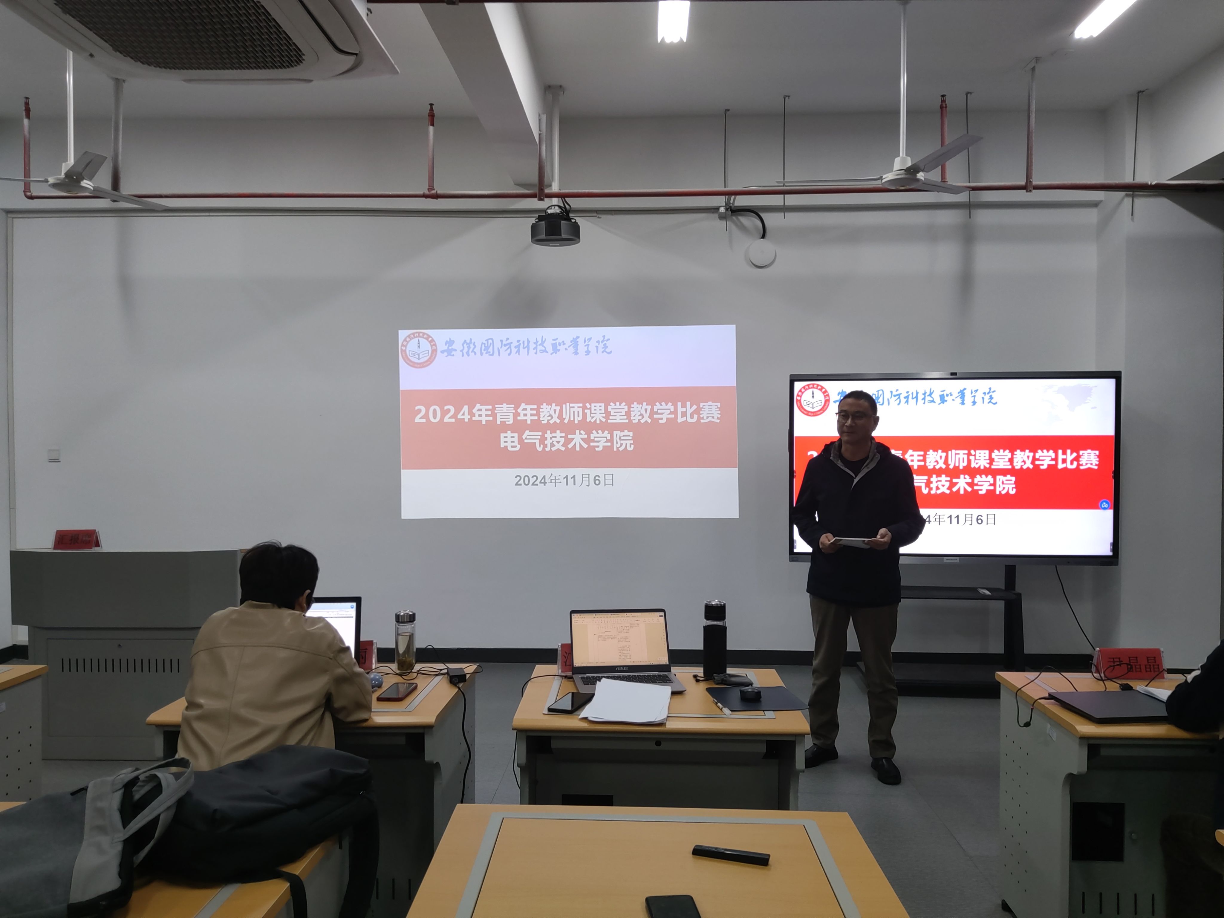 本次比赛,邀请了电气技术学院副院长江治国、教研室主任王丽、以及在省级教学比赛多次获奖的尹晶晶、耿婧、邹莉共五位老师担任评委。全体教师现场观摩。