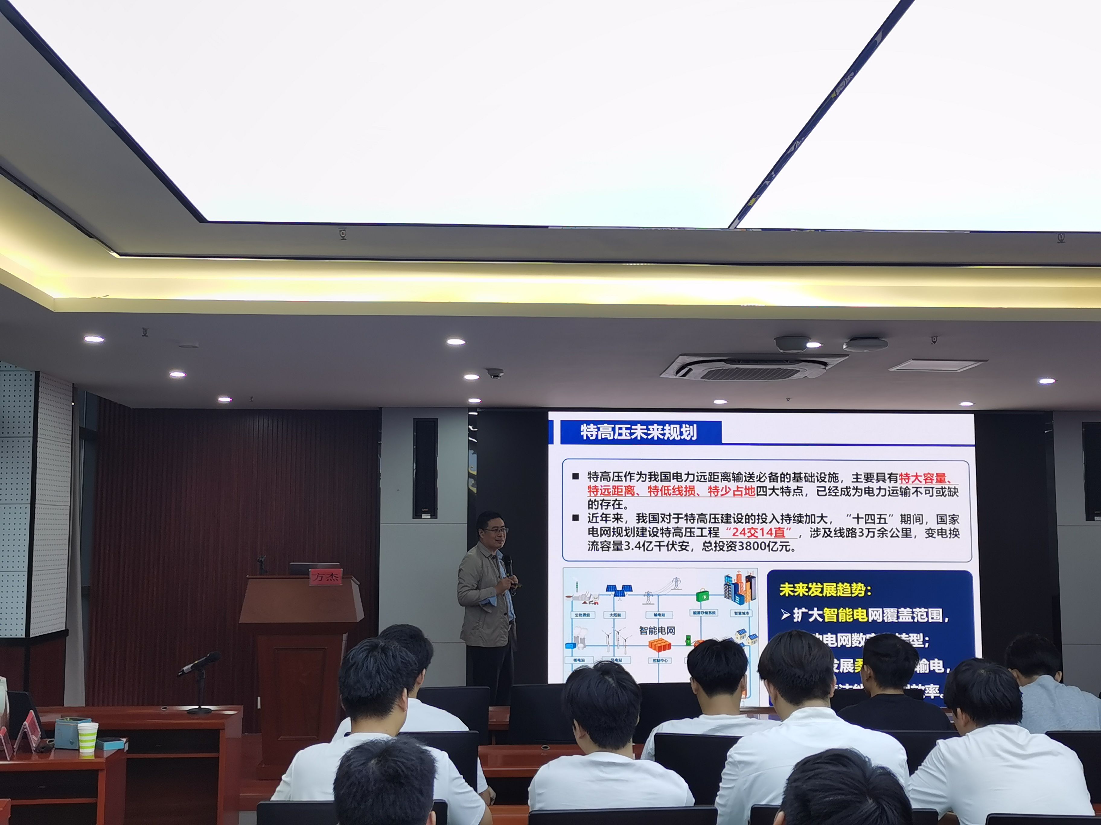 在专业解读环节,方杰深入剖析电气工程学科内涵,指出其以 “电能科学与技术”“电磁场与物质相互作用” 为核心知识领域,依托电网络理论、电磁场理论等三大理论基础,涵盖电机与电器、电力系统及其自动化等五大二级学科,服务于清洁可再生能源、智能电网等新兴产业。他还介绍了电气工程及其自动化专业的发展沿革,明确电机学、电力电子技术等核心课程,并结合安徽电力工业发展实例 —— 从佛子岭水电站的历史贡献到 “皖电东送” 特高压工程的战略意义,生动展现了专业在实际产业中的重要价值。
