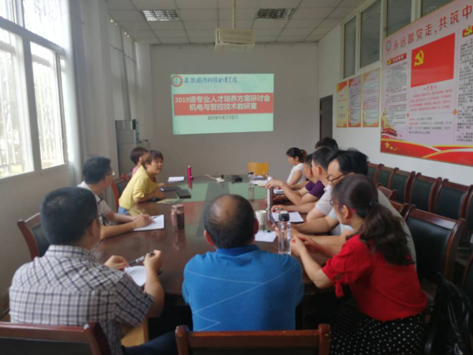 2019年6月12日下午在电气技术学院会议室召开2019级专业人才培养方案研讨会,机电与智控技术教研室全体老师参加,会议由教研室主任王丽主持。会议主要研讨了机电一体化技术、电气自动化技术、工业机器人技术三个专业人才培养方案的制定。结合前期调研,老师们献计献策,积极讨论。经过四个小时的会议,三个专业的人才培养方案初步确定,会议圆满结束。