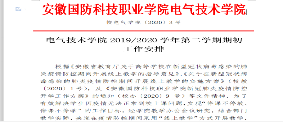 为最大程度减少因新型冠状病毒感染肺炎疫情延迟开学带来的影响,根据《安徽省教育厅关于高等学校在新型冠状病毒感染的肺炎疫情防控期间开展线上教学的指导意见》、《关于在新型冠状病毒感染的肺炎疫情防控期间开展线上教学的实施方案》(校教〔2020〕1号),及《万象城体育awcsport新冠肺炎疫情防控开学工作方案》的通知(校办〔2020〕9 号)等文件精神,为了有效解决学生因疫情无法正常到校上课问题,实现“停课不停教、停课不停学”的工作目标,电气技术学院结合部门教学实际,决定在疫情防控期间采用“线上教学”方式开展教学,并经学院教学办公会议研究,制定了线上教学方案和学生学习指导方案,要求教师上课前要认真做好备课工作,抓好疫情防控期间学生学习生活指导工作,确保防疫教学两不误。