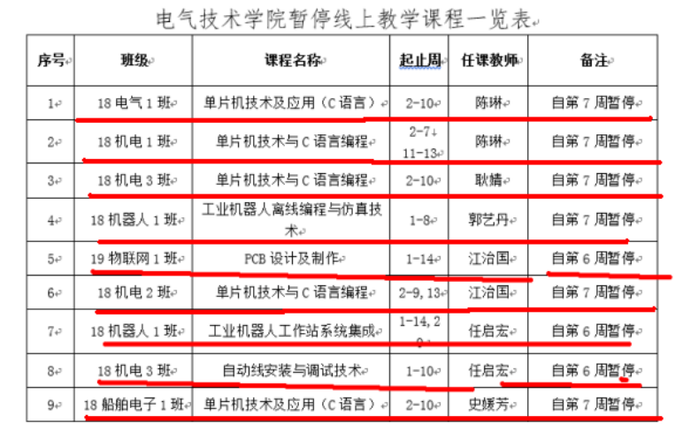 1、本周根据电气技术学院课程调整计划,共有陈琳老师的《单片机技术就应用》等9门课程停课,停课的课程信息如下:
