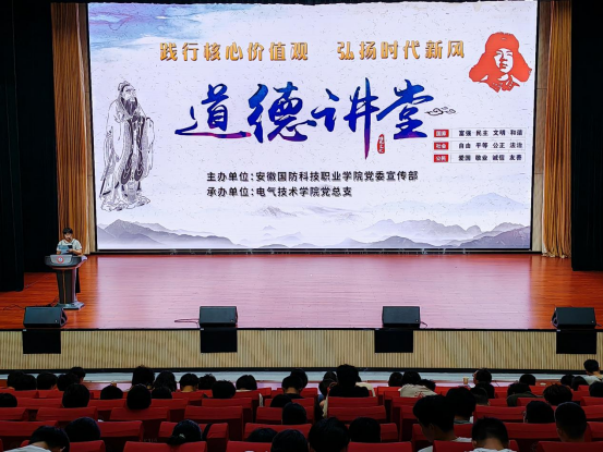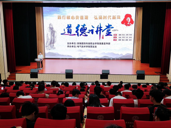 (本网讯 电气技术学院陈俊)为弘扬和培育社会主义核心价值观,大力弘扬中华民族传统美德,营造崇德向善、诚实守信、践行社会主义核心价值观的良好氛围,推进社会主义核心价值观融入校园文化建设,6月18日下午,由校党委宣传部主办、电气技术学院党总支承办的“践行核心价值观,弘扬时代新风”主题道德讲堂在产教融合中心多功能报告厅隆重举行。校党委宣传部副部长朱其阳,电气技术学院党总支副书记张丽、副院长江治国,电气技术学院全体辅导员和全校近300名学生代表参加了此次活动。