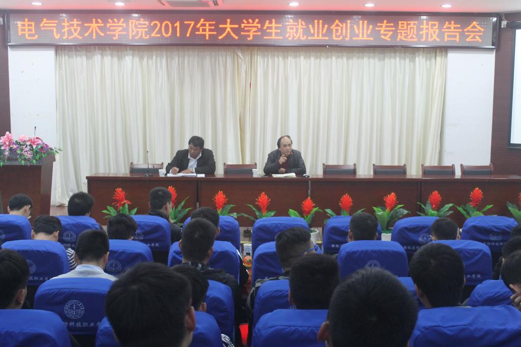 10月18日晚19:00,电气技术学院在校图书馆报告厅举办2017年大学生就业创业专题报告会,报告会由电气技术学院党总支书记王希江主持,15级全体在校学生和部分老师聆听了裕安中学校长、万象城体育awcsport六安校友会会长孙超的精彩演讲。