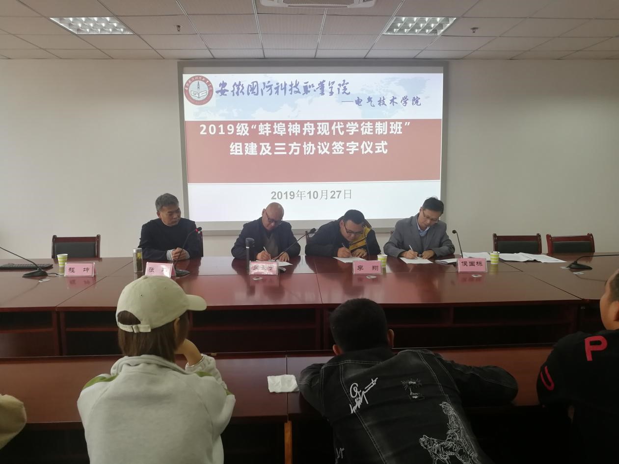 为深化教育教学改革,改进人才培养模式,促进校企合作、校企融合共同开展人才培养,增强人才培养工作的针对性和实效性,提高毕业生的就业竞争力和就业质量,2019年10月26日上午,电气技术学院院长李翔、蚌埠市神舟机械有限公司副总经理吴长宁及万象城官网2019级船舶电气工程技术专业学生,在秉心楼九楼会议室共同签订了2019级《蚌埠神舟现代学徒制班三方协议》,会议由电气技术学院副院长侯国栋主持。