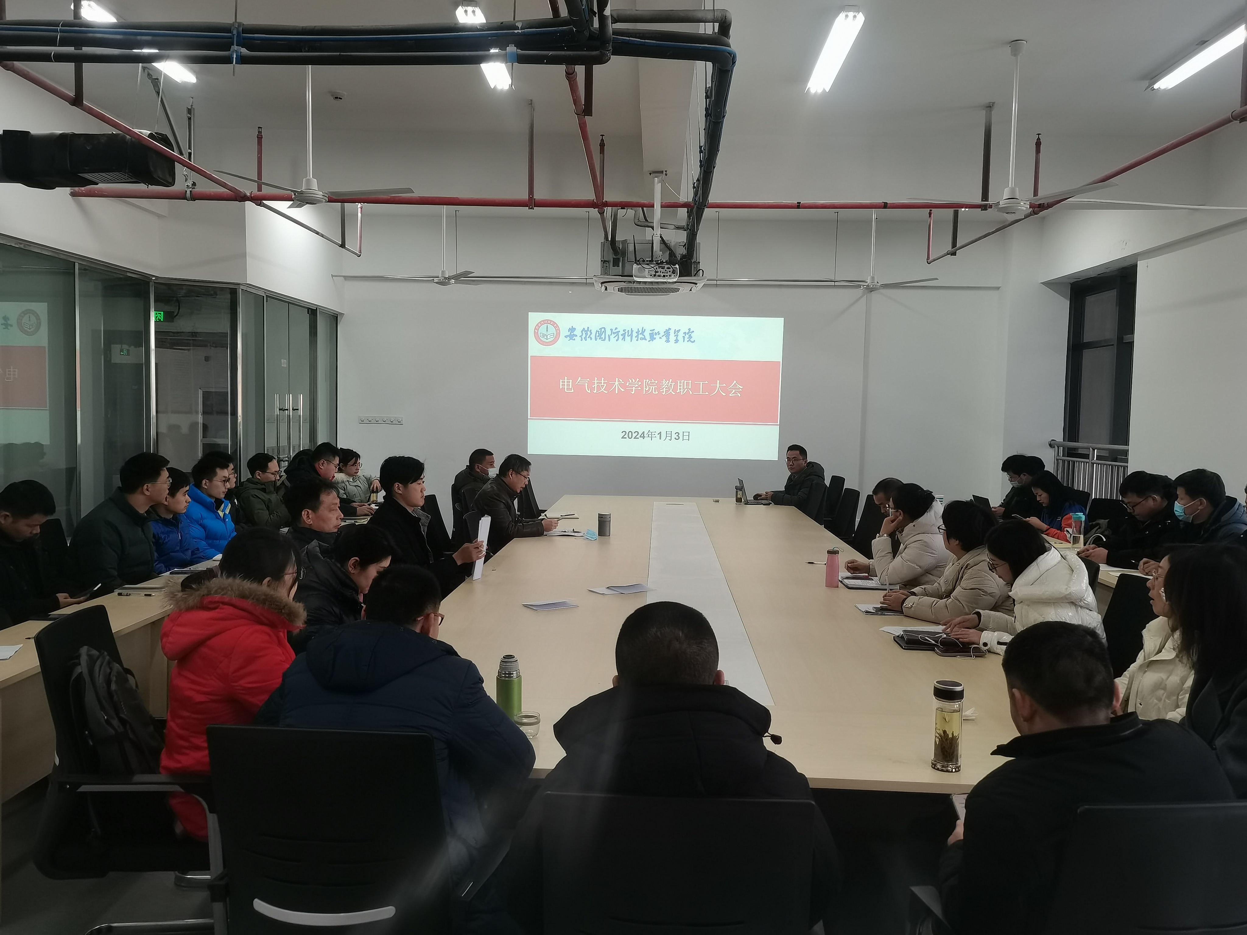 1月3日下午,电气学院在产教融合中心3楼会议室召开期末安全工作专题会议,电气技术学院院长李翔、党总支副书记张丽、副院长江治国及全体教职工参加本次会议。