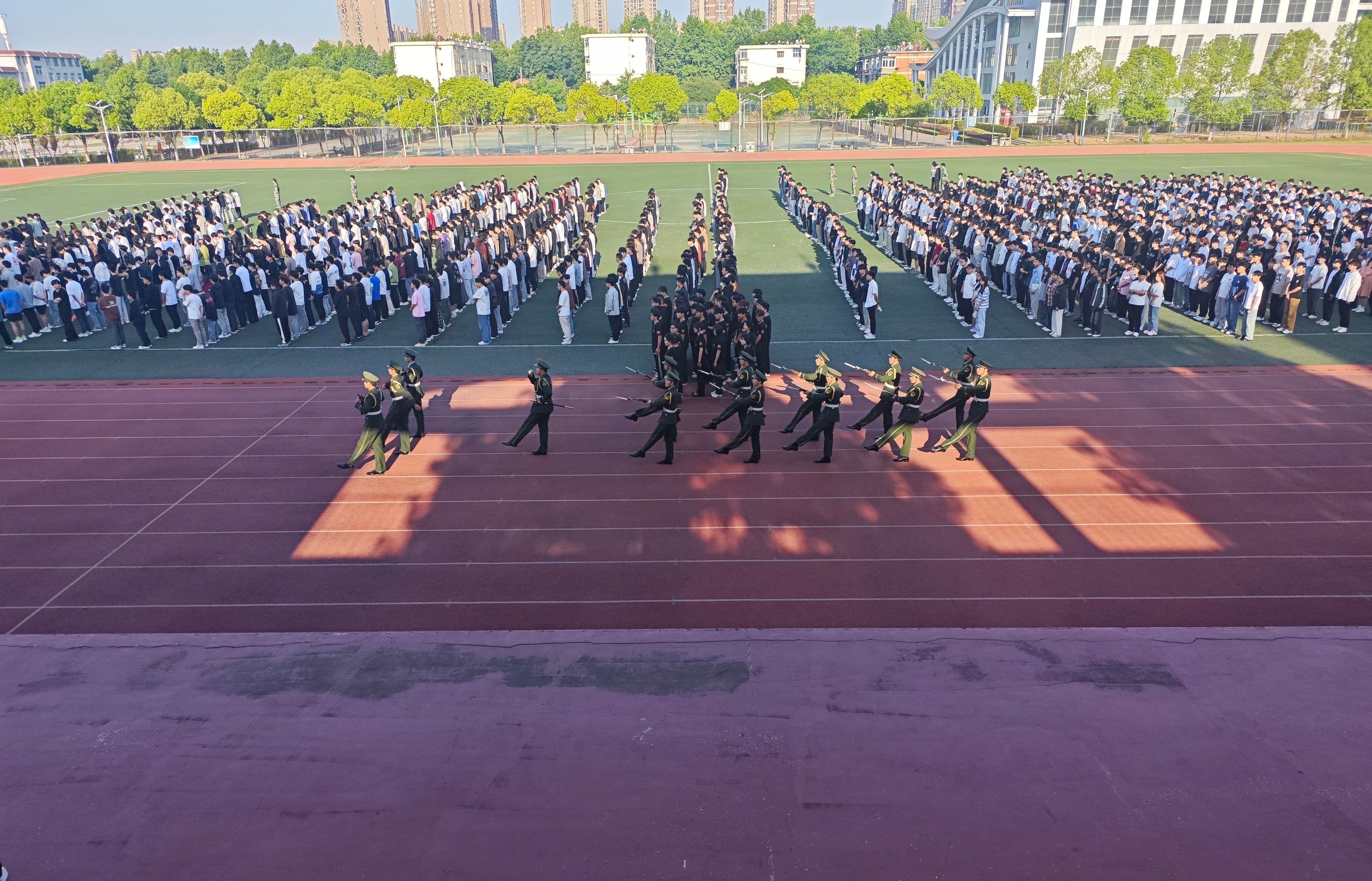 早晨7:00整,伴随着国旗护卫队铿锵有力的步伐,升旗仪式拉开序幕。国旗护卫队队员们昂首阔步,意气风发,以饱满的精神状态走向国旗台。笔挺的军姿,有力的摆臂,坚定的脚步,展现出时代青年昂扬的风采。