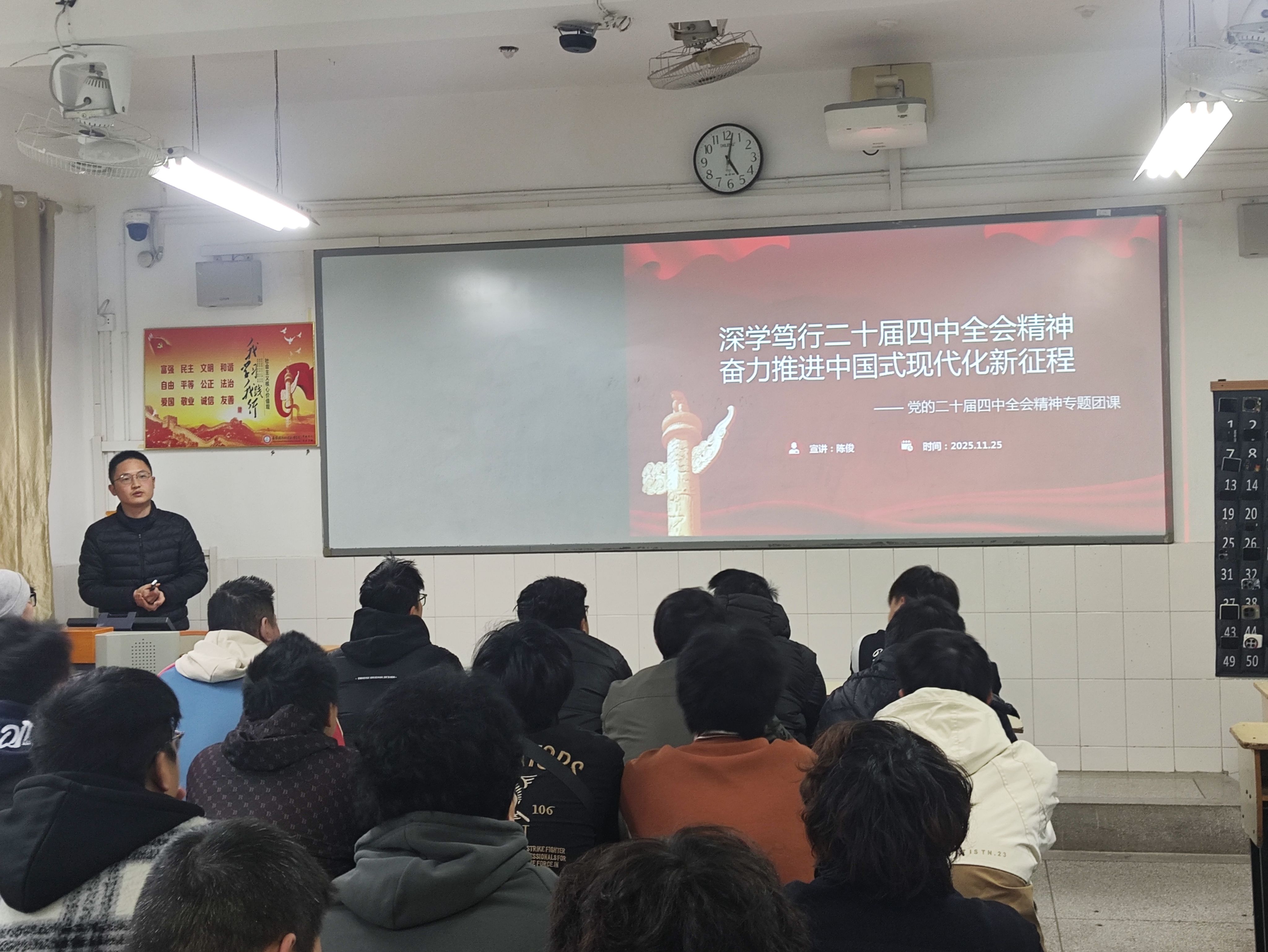 本网讯(学生通讯员 张宽洁)为全面深入学习贯彻党的二十届四中全会精神,引领团员青年深刻把握“十五五”规划战略部署,将个人成长融入中国式现代化建设大局,进一步落实共青团改革要求,强化团干部对青年的思想引领与服务实效,11月25日下午,电气技术学院团总支书记陈俊在2教403教室,为联系团支部24机电1班全体团员青年讲授专题团课。
