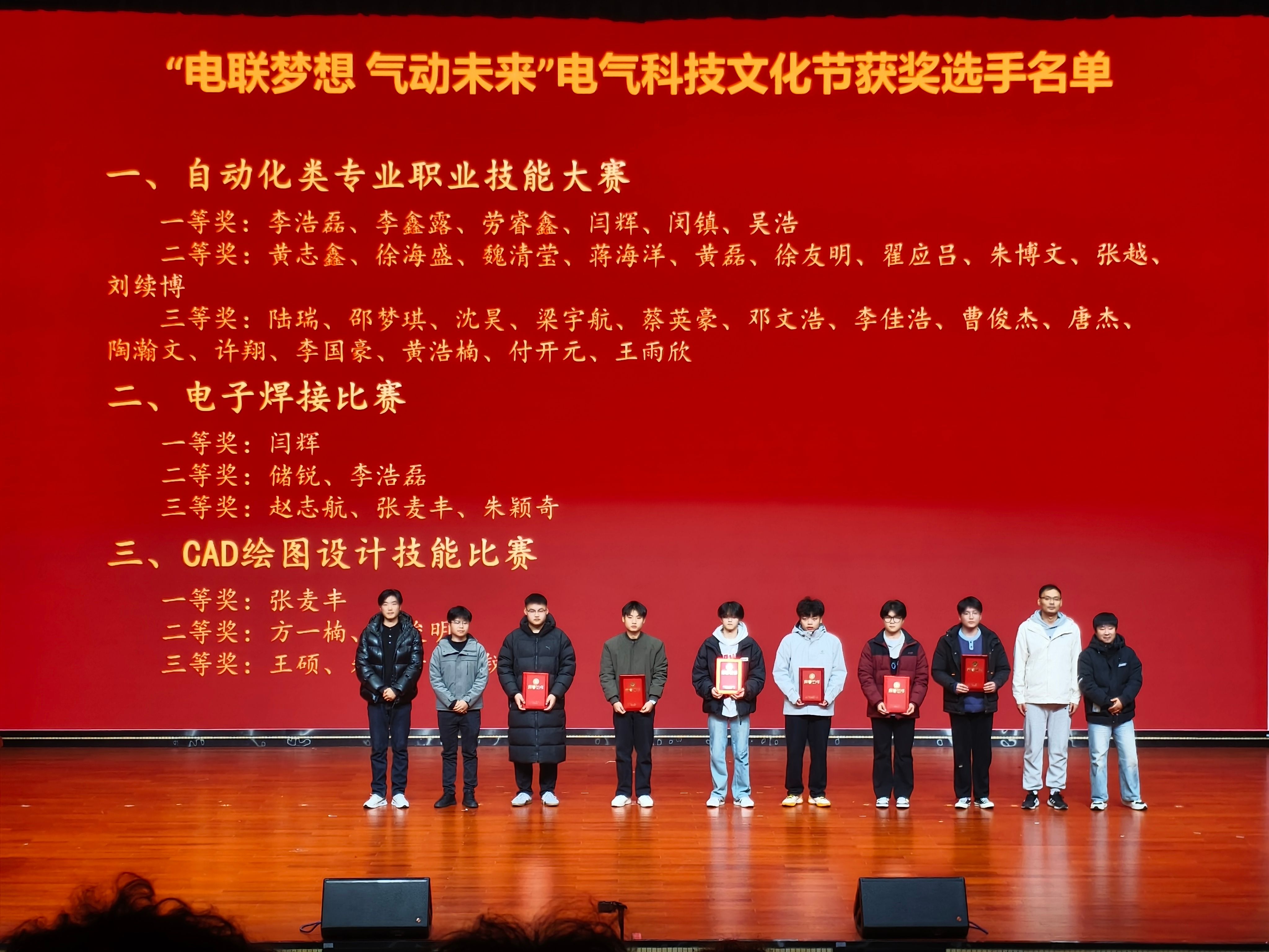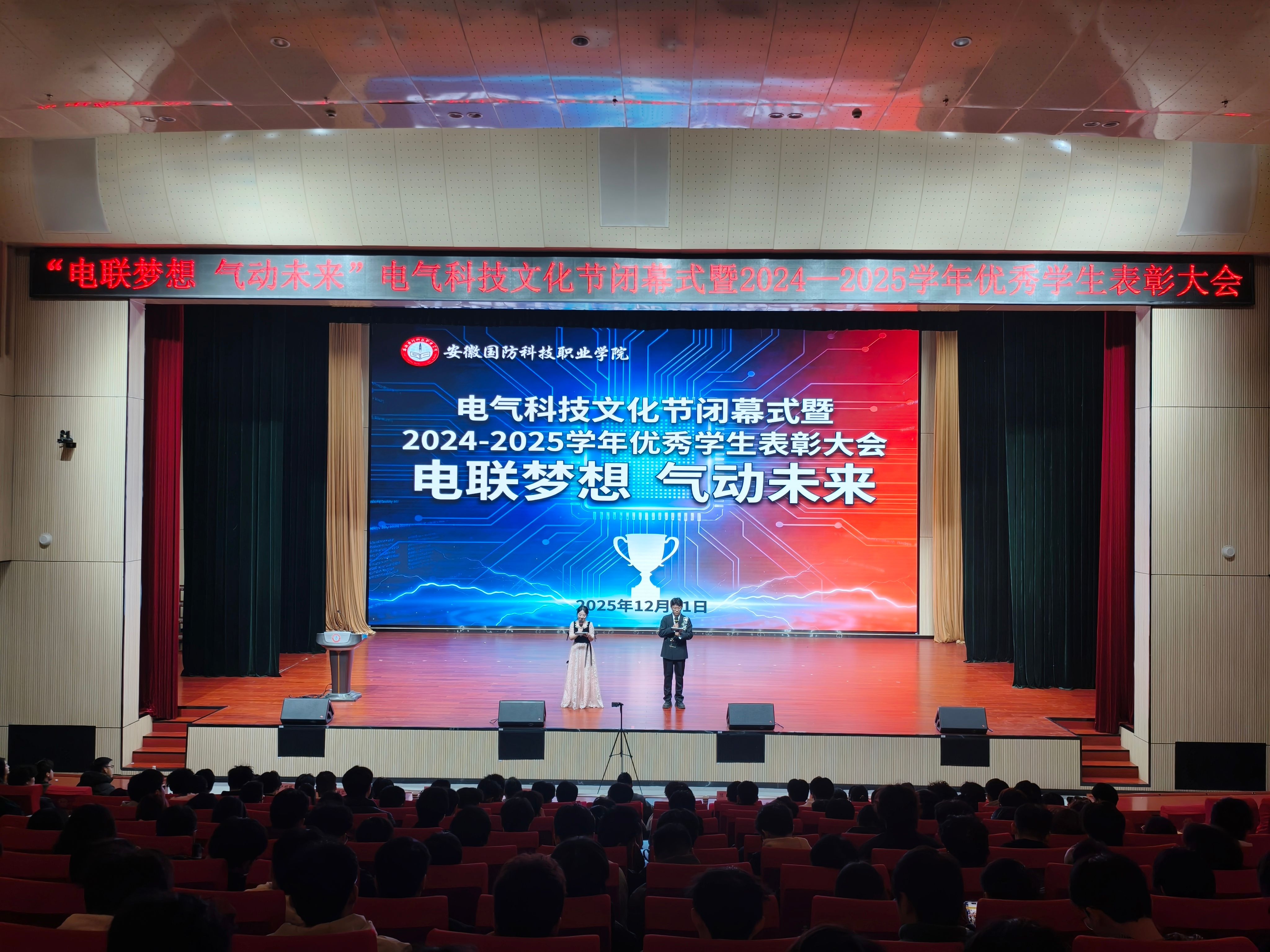 本网讯(电气技术学院 陈俊)为深入贯彻“以赛促学、以文化人”的育人理念,全面展示我院学子在专业技能、科技创新与综合素质方面的丰硕成果,充分发挥先进典型的示范引领作用,营造积极向上、追求卓越的校园文化氛围,我院于12月11日晚在校多功能报告厅隆重举行电气科技文化节闭幕式暨2024-2025学年优秀学生表彰大会。学院党总支副书记、团总支书记、全体专职辅导员及300余名学生代表齐聚一堂,共同见证这场融汇科技探索、文化传承与青春荣耀的年度盛事。