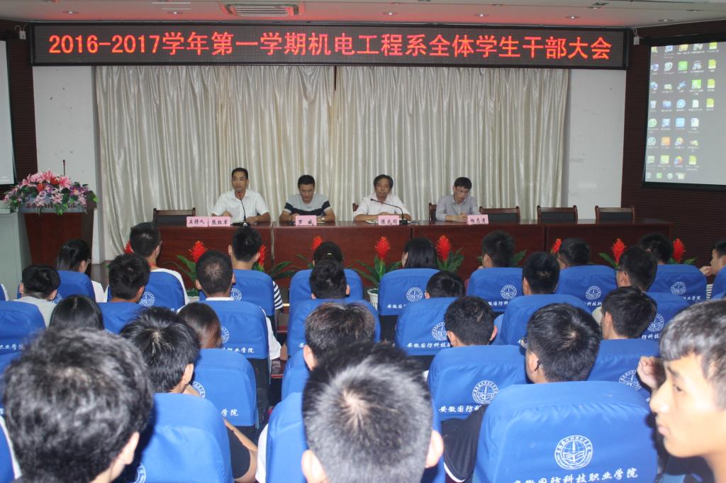9月8日,晚19:30分,机电工程系在图书馆报告厅召开新学期学生干部大会。党总支书记陈兆同、副书记罗威、团总支书记张红军、辅导员杨志清老师及系属全体学生干部参加了本次大议。会议由张红军主持。