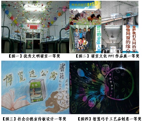 第八届“寝室文化节”活动有着丰富的内容和多样的形式,对学生的思想修养、文化修养综合能力等方面的提高有着积极的影响。此次活动分为四个环节,分别是“优秀文明寝室”评比、“社会公德宣传板设计”、“寝室文化PPT作品展示”、“智慧巧手工艺品创意”。