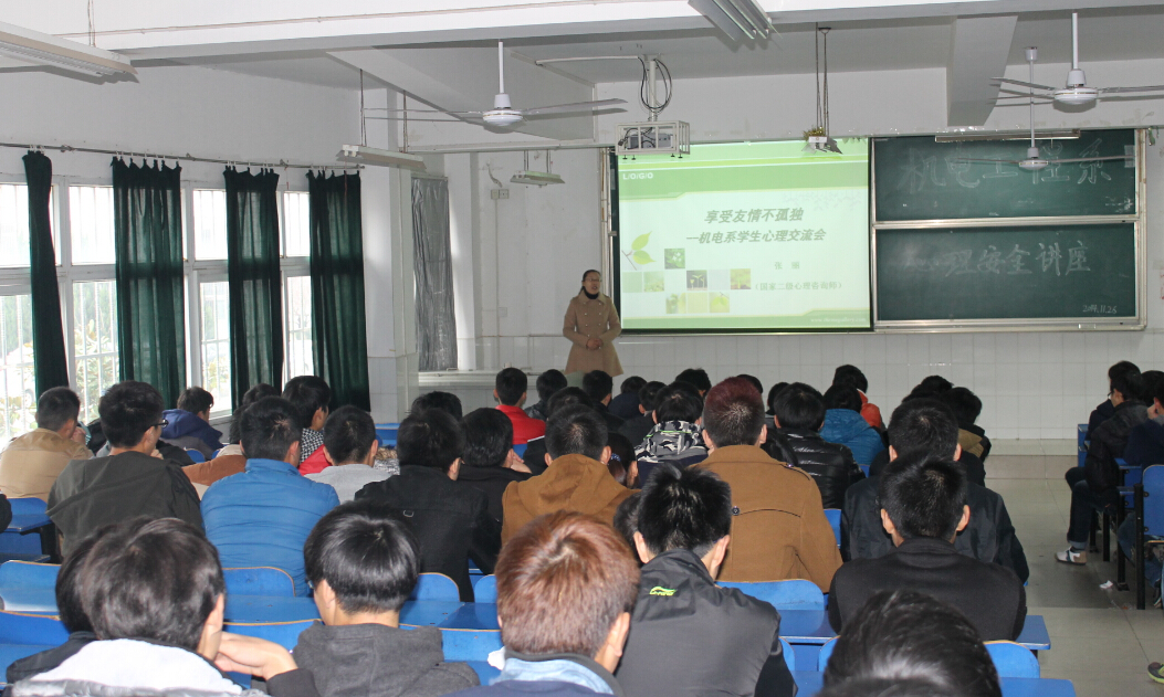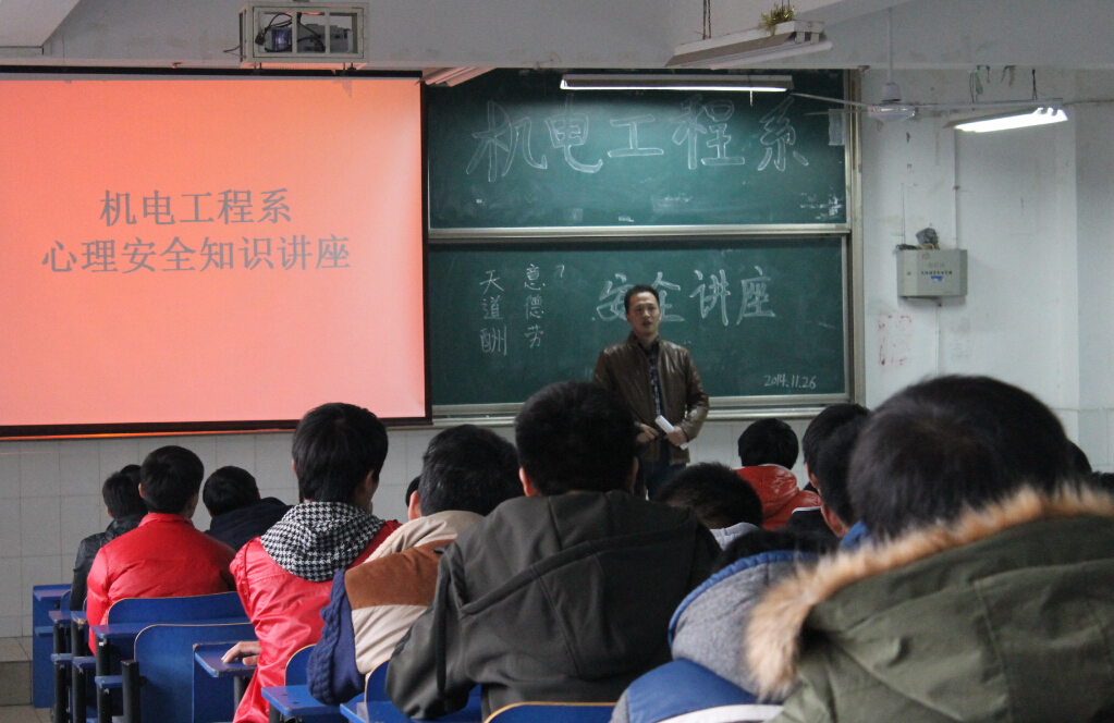 11月26日下午,机电工程系在2#105教室成功举办了以“与心灵相约,与安全同行”为主题的心理健康暨安全知识讲座。此次讲座分别由院心理咨询中心主任张丽和机电工程系14级辅导员侯超众主讲,各班级心理委员、安全委员和班级安全工作组全体成员聆听了讲座 。