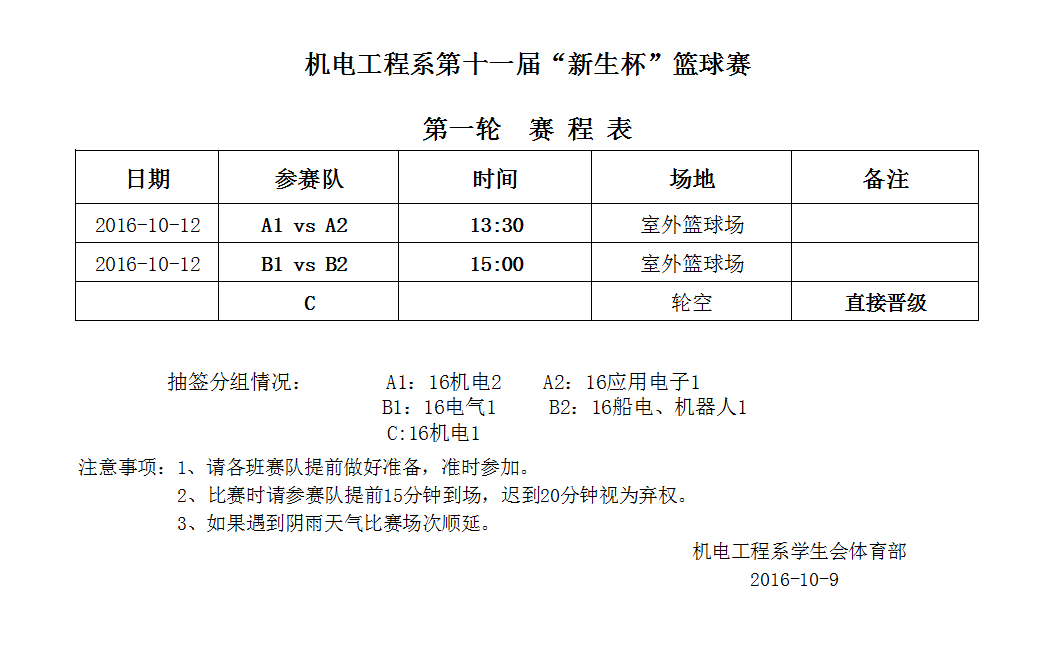 机电工程系第十一届“新生杯”男子篮球赛第一轮赛程