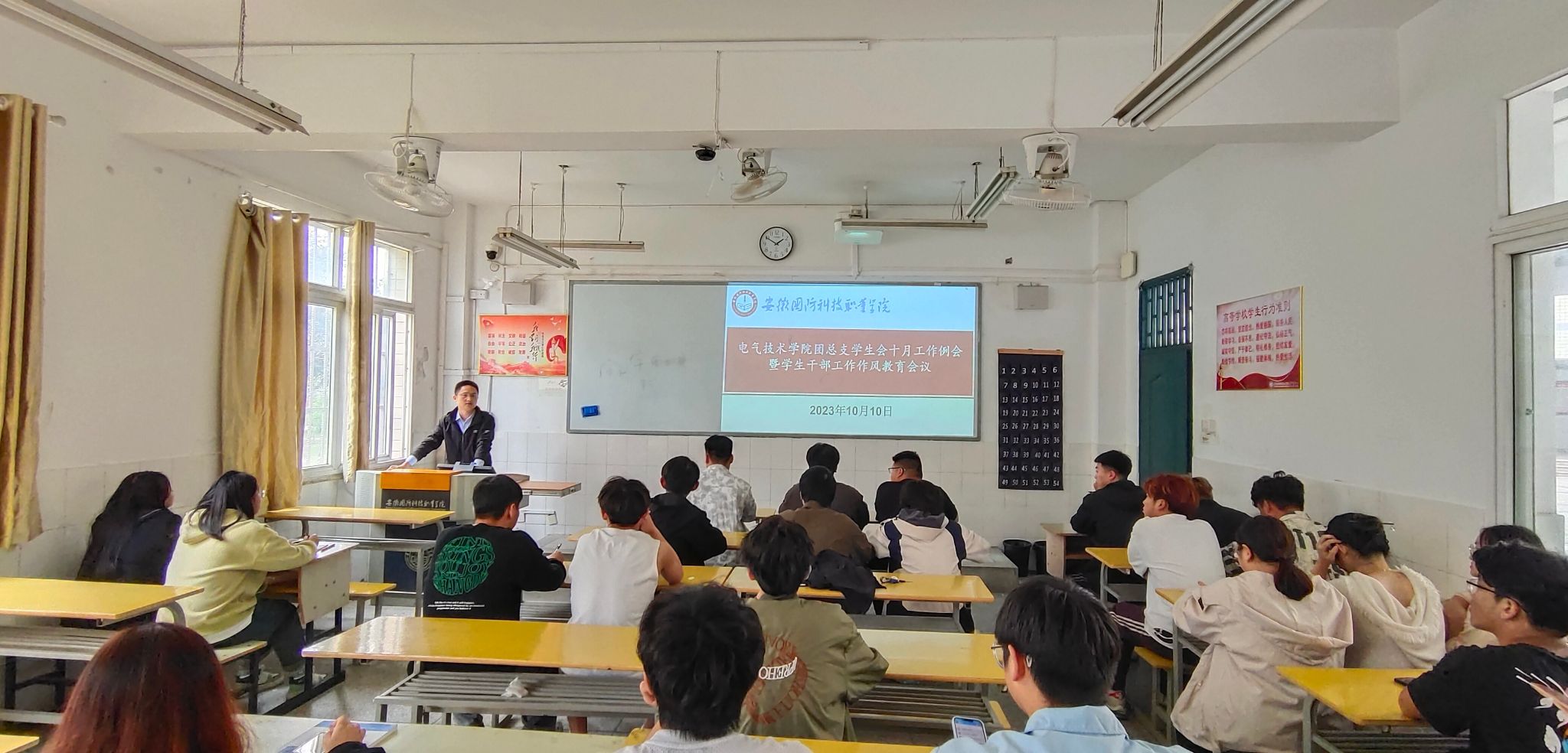 为捋顺工作思路,全面贯彻落实学校各项工作要求,规范团总支学生会学生干部工作纪律,营造良好的工作作风,10月10日中午,电气技术学院团总支学生会在2号教学楼102教室组织召开电气技术学院团总支学生会十月工作例会暨学生干部工作作风教育会议。会议由电气技术学院团总支书记陈俊主持召开,学院团总支学生会全体学生干部参加。