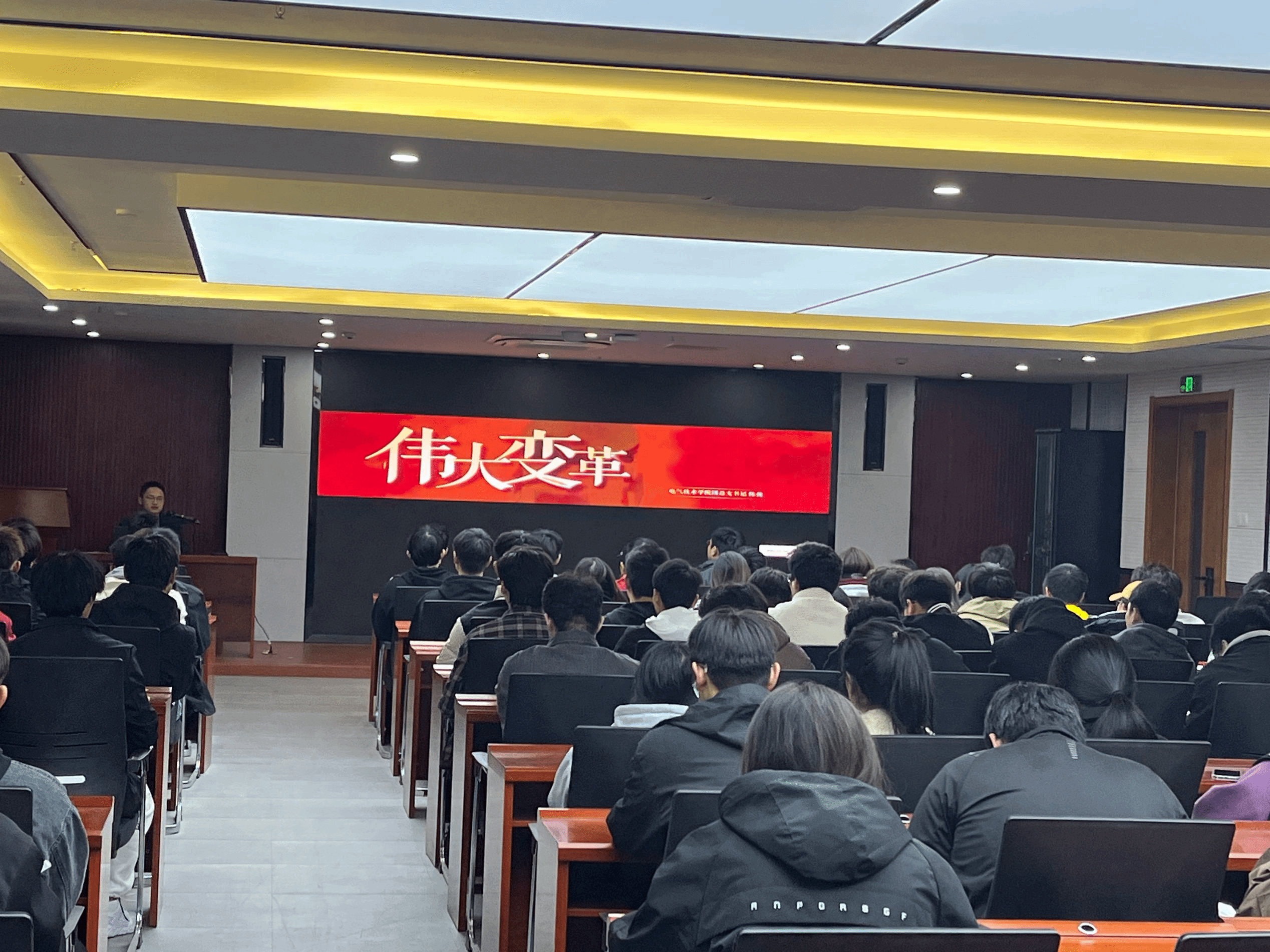 为深入贯彻落实党的二十大精神,深刻感受新时代十年伟大变革,11月10日,电气技术学院组织各班级团支书、22物联网1班团支部和各学院团支书代表在产教融合中心第一报告厅开展“伟大变革”主题团课活动,此次团课由电气技术学院团总支书记陈俊主讲。