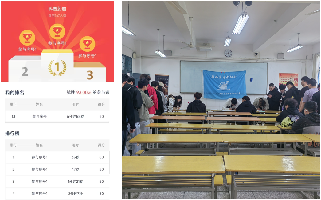 本次活动,通过发放船舶类科普题,要求参与线上作答的同学以最短的时间完成全部试题。比赛名次从全部答对的同学中,以用时长短排序。经过激烈角逐,共计有12位同学从167名参与答题的同学中脱颖而出,分别获得比赛一、二、三等奖。