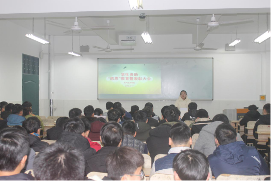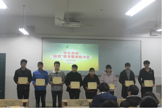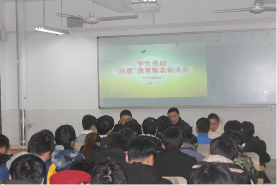 2018年1月17日晚,电气技术学院在2教108教室召开学生资助“感恩”主题教育暨表彰大会。学院党总支副书记罗威、学生资助工作专职老师汤晓莉及学院全体各类受奖助学生参加了会议,会议由15级辅导员陈俊老师主持。
