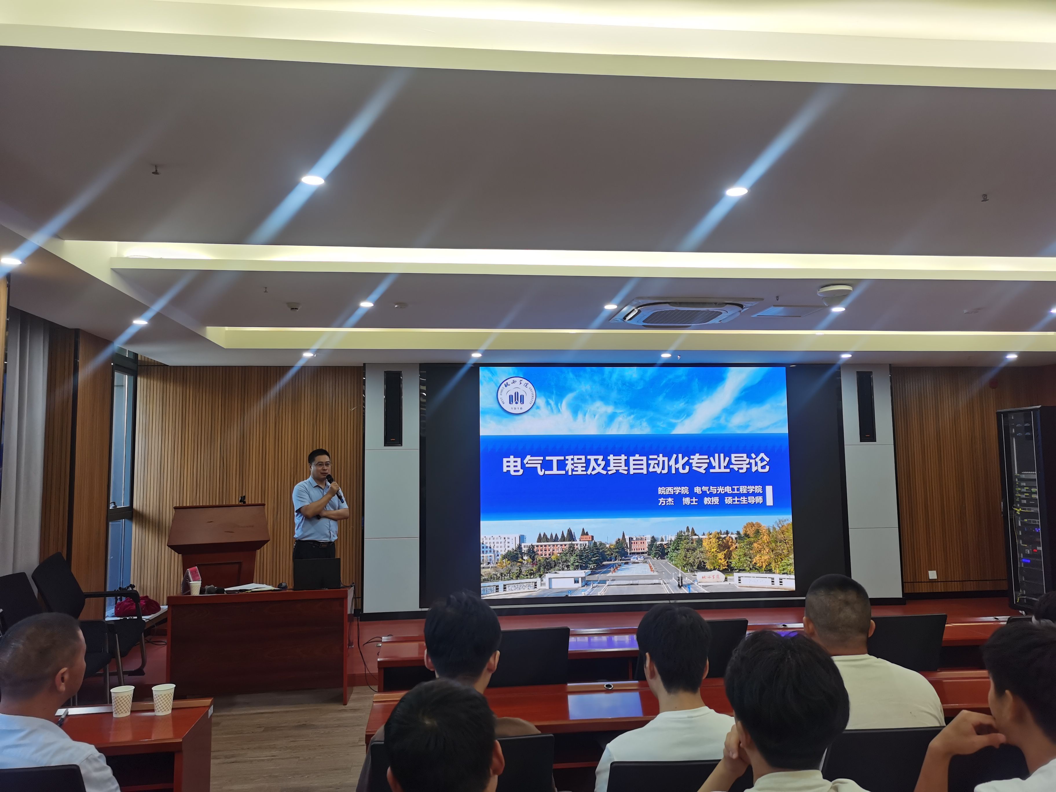 本网讯 为了帮助学生对专业有着更加直观生动的了解,指导学生清晰专业定位、专业特色以及发展方向与趋势,提升学生对专业课程体系的了解,促进学生更好地开展学业规划和职业规划,明确大学期间学习努力目标。9月5日,电气技术学院邀请皖西学院电气与光电工程学院院长方杰教授,为2024级电气工程及自动化专业本科班新生作专业导论专题讲座。本次讲座由电气技术学院副院长江治国主持,24级电气本科班全体学生参加了此讲座。