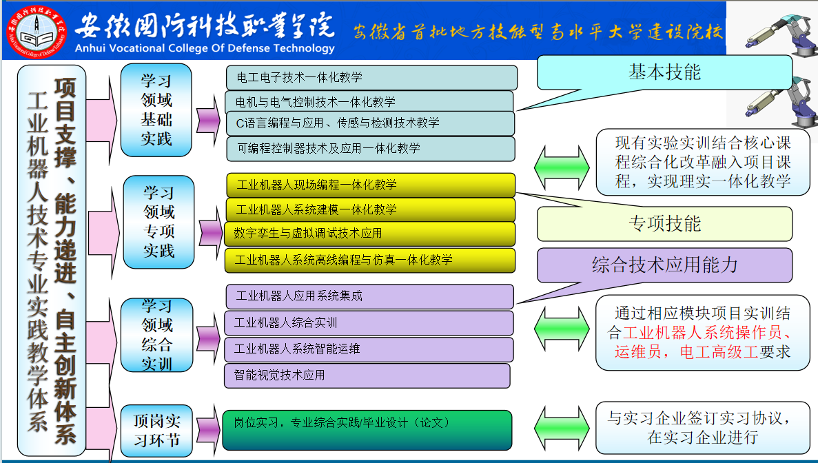 工业机器人技术专业现有校内专业教师14人,兼职教师2人。其中正高职称3人,副高职称4人,中级职称7人,拥有安徽省专业带头人1人,安徽省教学名师2人,安徽省技能大师2人、安徽省技术能手1人。