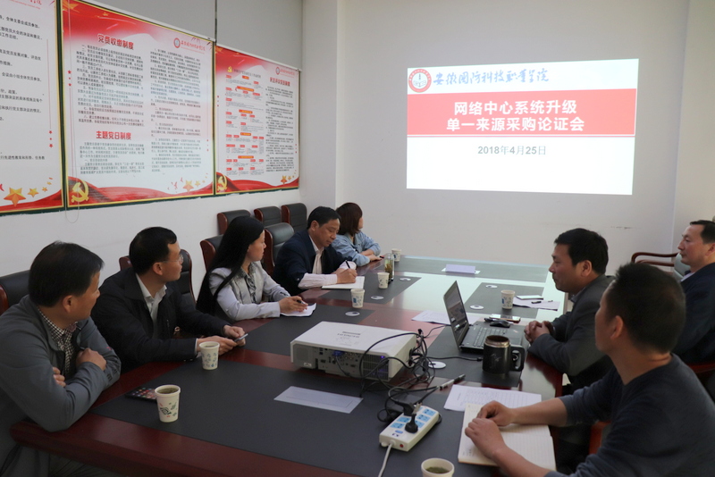 为了进一步促进应用系统建设,推动学院信息化发展,4月25日下午,在图书馆会议室召开了2018年应用系统升级单一来源采购论证会。网络信息中心邀请了皖西学院网络中心主任周先存、皖西卫生职业技术学院图文信息中心主任罗志东、六安职业技术学院网络中心主任陈功平作为校外专家,邀请了学校纪委书记陈兆同、财务处处长李大武,国资办干事董芳作为校内专家参加评审,参加会议的还有学校网络中心主任李中永、副主任范文广、信息系统管理员洪腾飞等。