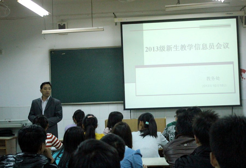 10月18日晚,教务处在2号教学楼303教室召开了2013级(新生班)教学信息员工作会议。会议由教务处叶高洁老师主持,教务处长王志宏参加会议并发表了讲话。会上,王志宏首先介绍了学院教务处的基本情况,强调了学院教学督导工作的重要性,说明了教学信息员的工作职责并讲解了学院优秀教学信息员的评选办法。随后,叶高洁老师讲解了《教学日志》和《学生信息反馈月报表》的填写方法和相关要求,对新生教学信息员的具体工作进行了布置并提出要求,并为上学期学院优秀学生教学信息员颁发了荣誉证书。最后,叶高洁老师对2013级教学信息员提出的疑问进行了解答。