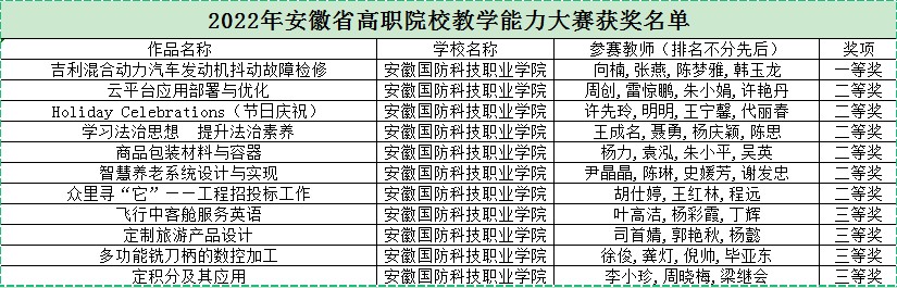 近日,安徽省教育厅公布了2022年安徽省高等职业院校教学能力大赛获奖名单,万象城官网参赛团队在本次大赛中再获佳绩,11支参赛团队全部获奖,其中一等奖1项,二等奖6项,三等奖4项,学校获大赛“最佳进步奖”。