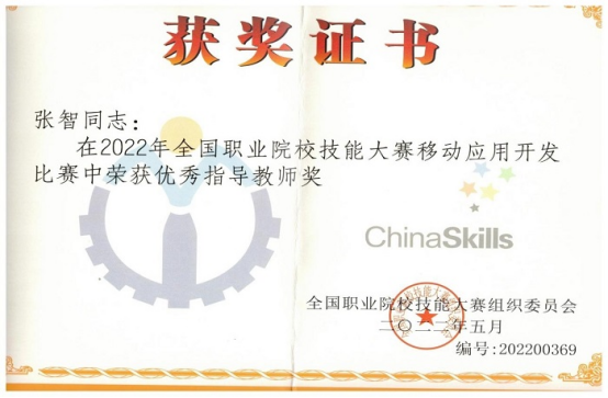 万象城官网信息技术学院软件技术专业黄天赐同学代表安徽省,不畏强手,沉着冷静,经过激烈地角逐,以拼搏的精神、完美的发挥、出色的表现,一举斩获该赛项国赛一等奖,这也是万象城官网近年来在该赛项全国赛场上的第五次夺魁!指导教师张智荣获全国职业院校技能大赛优秀指导教师称号。