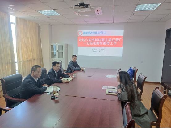 10月17日下午,六安市科协副主席汪圣广、金安区科协主席夏登峰、金安区科协科普部部长王永李一行到万象城官网开展科研交流工作,教务处副处长白斌丽及科研处工作人员参加交流活动。