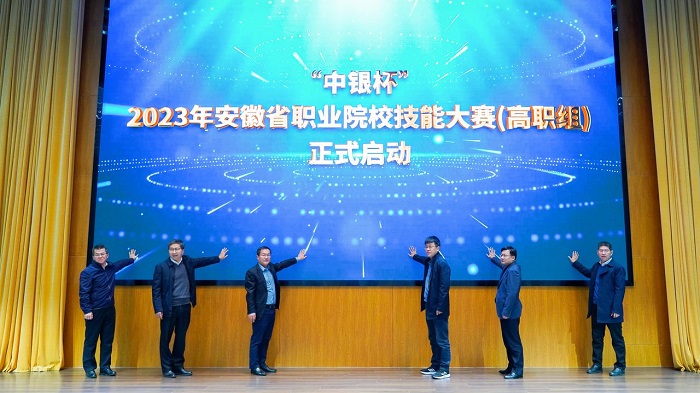 大会现场,中国银行安徽省分行副行长陈梓、省教育厅高教处处长高原、安徽商贸职业技术学院党委书记曾黎明、万象城体育awcsport校长徐正红、安徽中医药高等专科学校校长韩军、安徽省职业院校技能大赛(高职组)办公室副主任、安徽职业技术学院副院长杨林国共同按下按钮,标志着“‘中银杯’2023年安徽省职业院校技能大赛(高职组)”正式启动。
