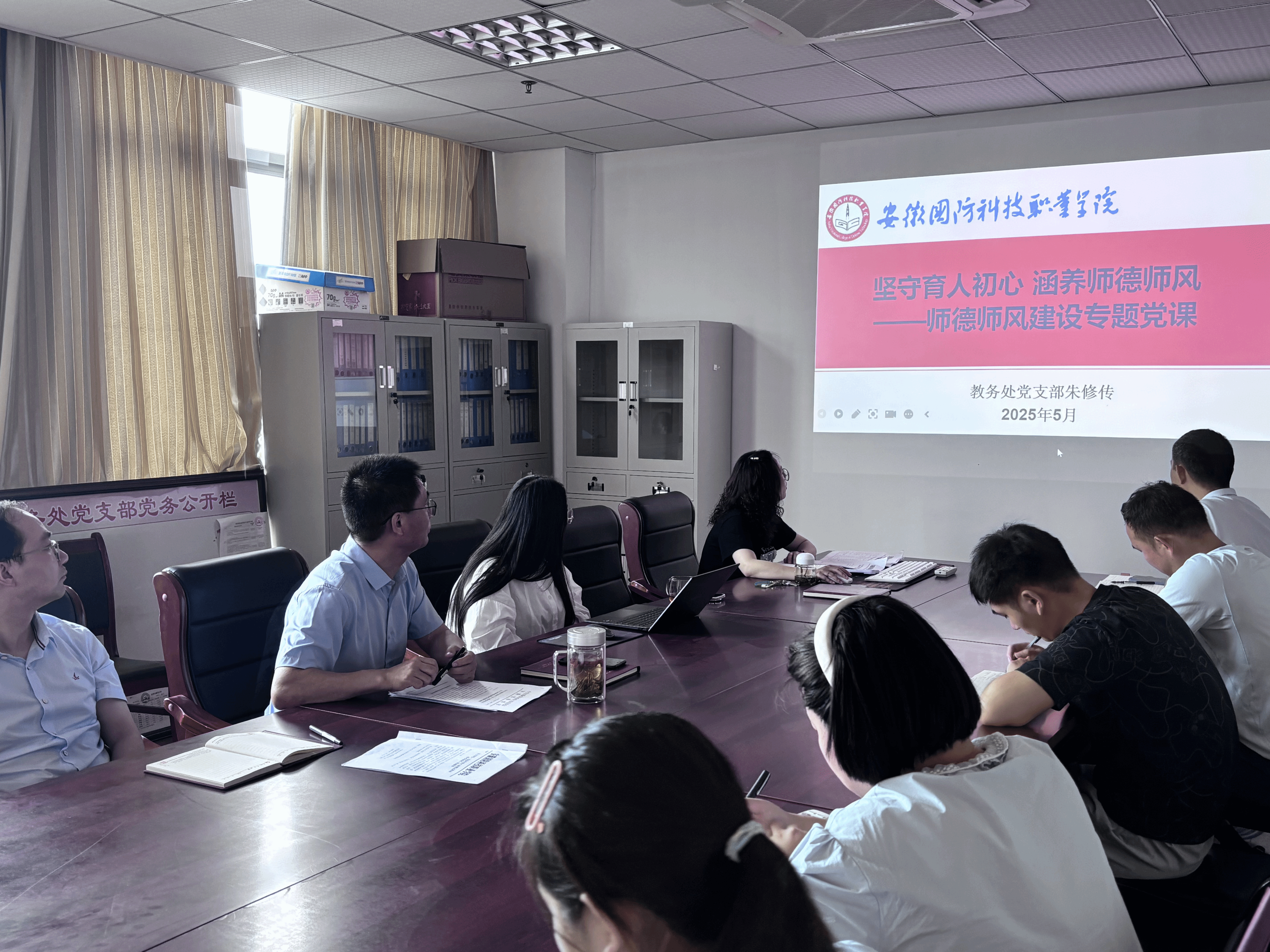 5月20日下午教务处党支部在秉心楼1206会议室开展以“坚守育人初心——涵养师德师风”为主题开展专题党课,支部全体党员参加,党支部书记朱修传主讲。