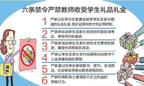 这份名为《严禁教师违规收受学生及家长礼金等行为的规定》的文件明确了6条“红线”:一是严禁以任何方式索要或接受学生及家长赠送的礼品礼金、有价证券和支付凭证等财物;二是严禁参加由学生及家长安排的可能影响考试、考核评价的宴请;三是严禁参加由学生及家长安排支付费用的旅游、健身休闲等娱乐活动;四是严禁让学生及家长支付或报销应由教师个人或亲属承担的费用;五是严禁通过向学生推销图书、报刊、生活用品、社会保险等商业服务获取回扣;六是严禁利用职务之便谋取不正当利益的其他行为。