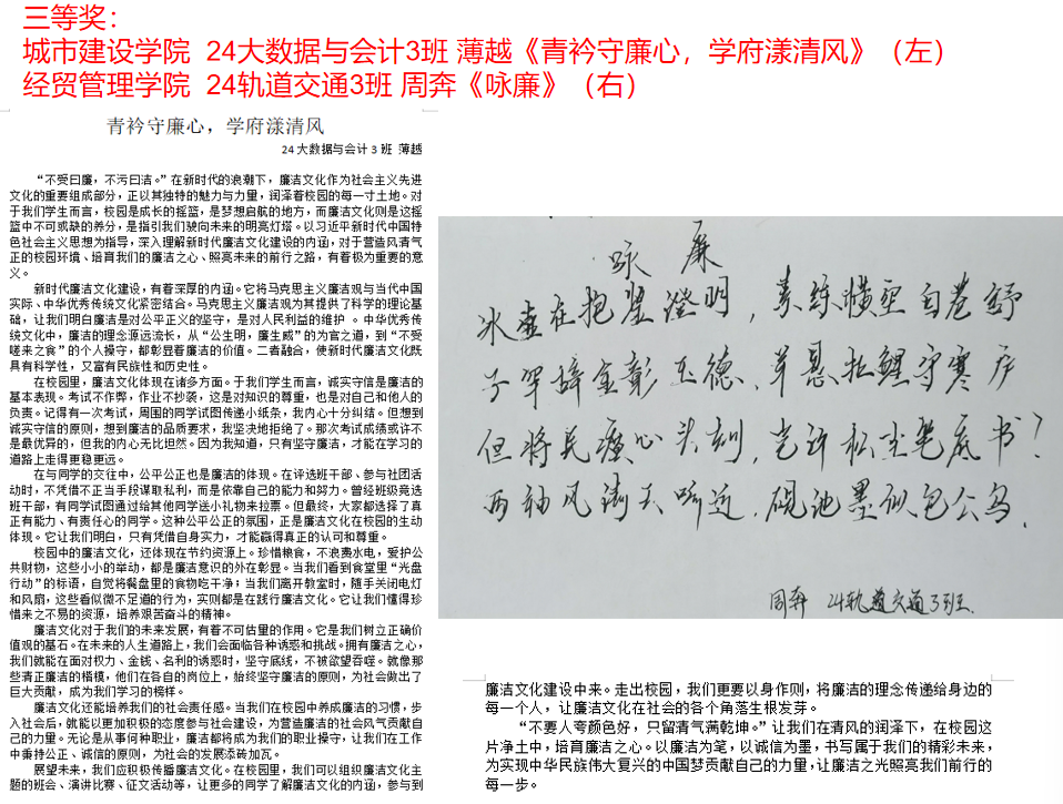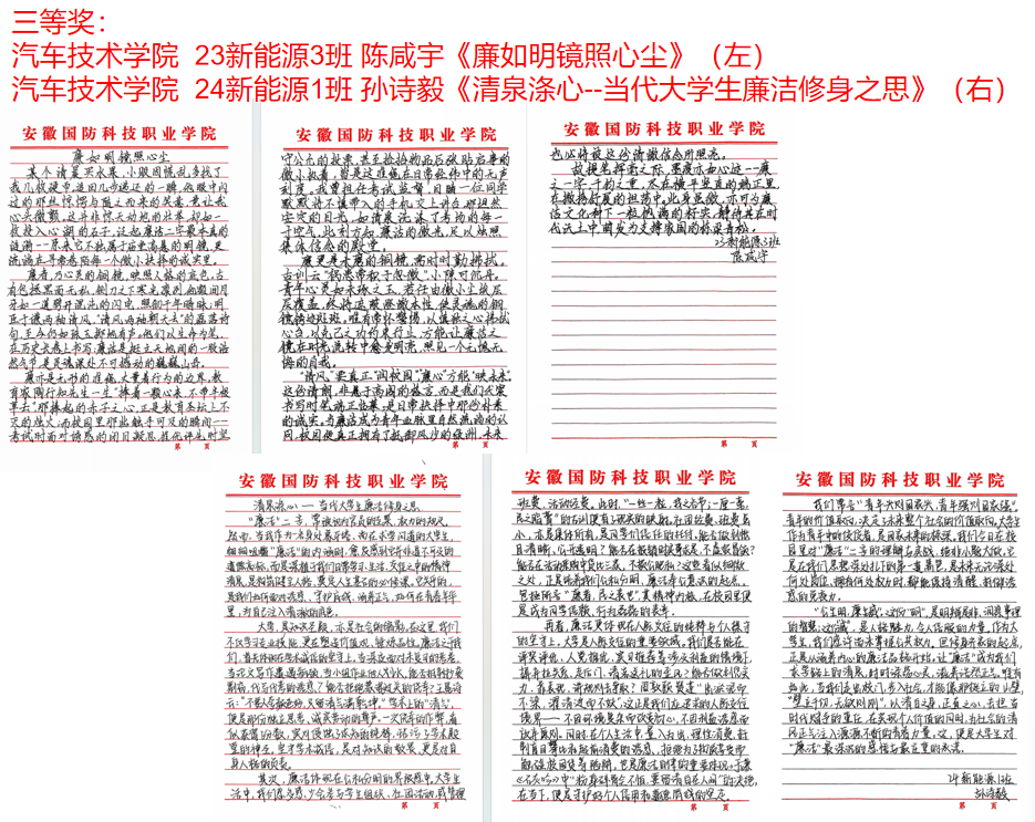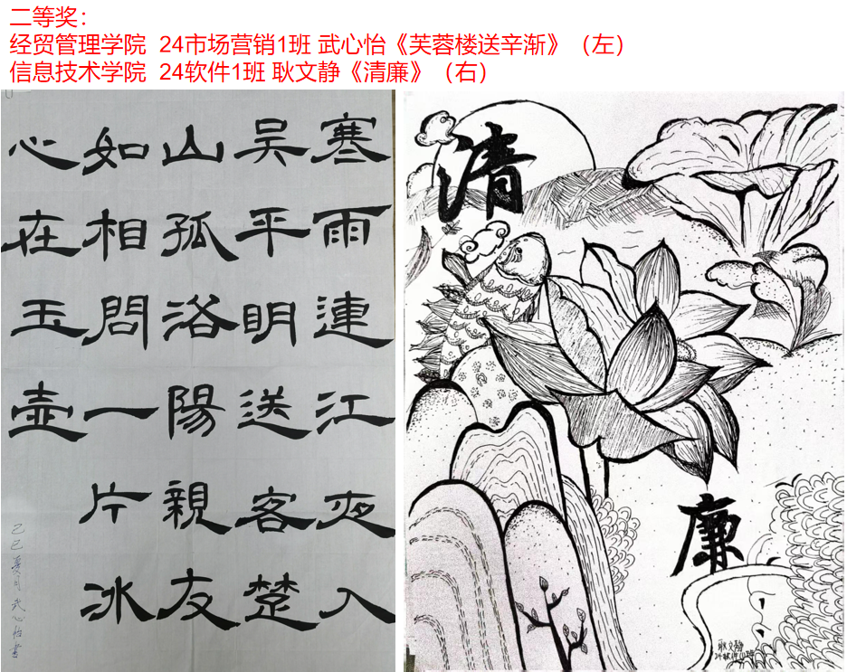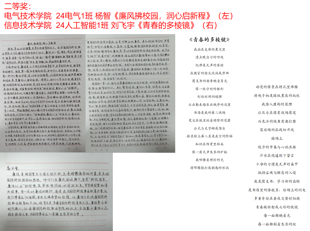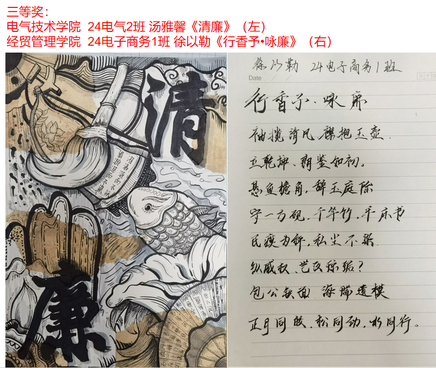 此次活动围绕“清风润校园,廉心映未来”主题,全方位、多角度地展现了师生们对廉洁文化的深刻理解与独特诠释。活动得到了全校师生的积极响应与广泛参与,共征集到各类作品46件。由纪委办公室、校团委、二级学院组成的评审组秉持公平、公正、公开的原则,对所有参赛作品进行了严格筛选与评审,最终评选出一等奖二名、二等奖四名、三等奖六名。